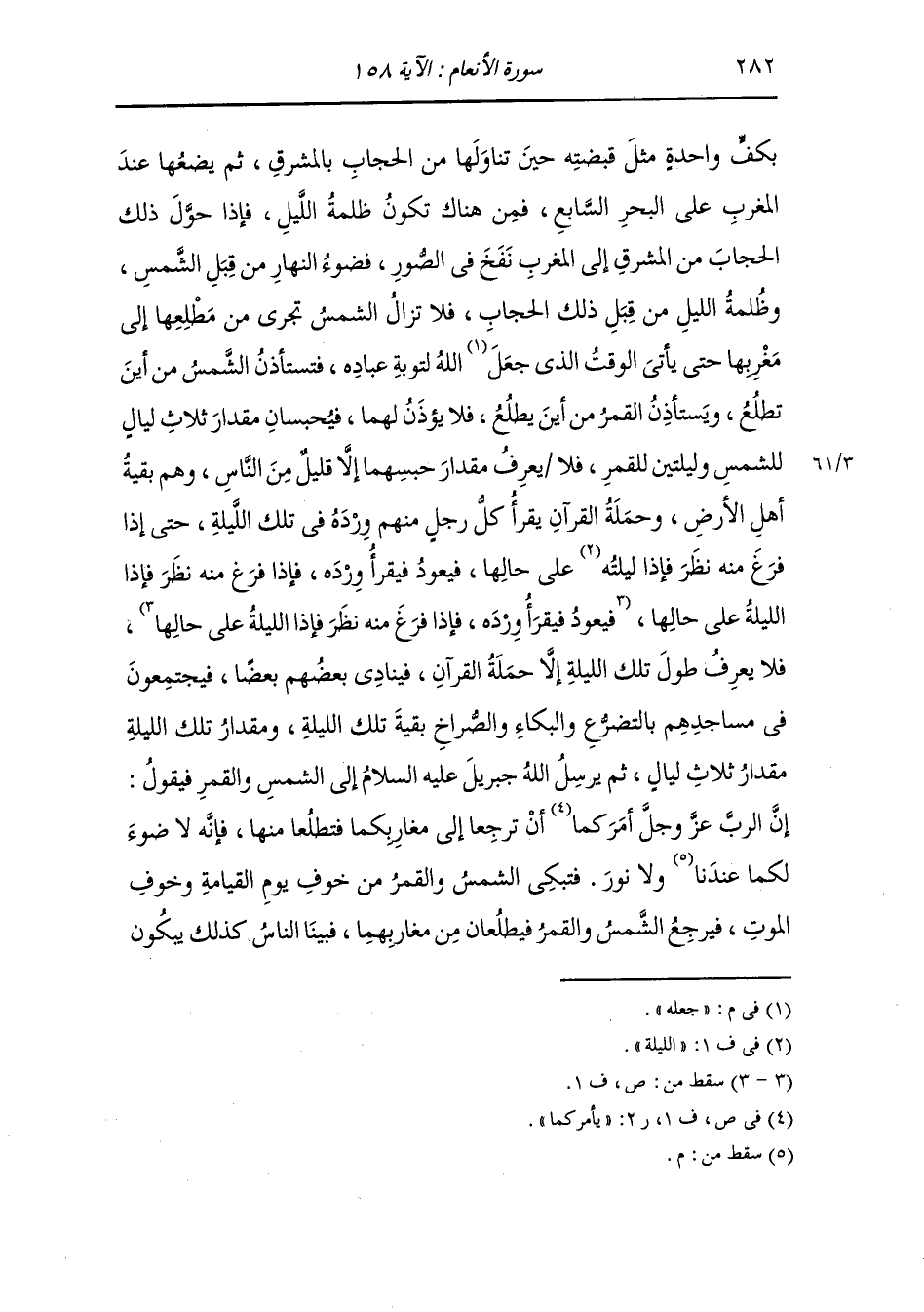 بكف واحدة مثل قبضته حين تناولها من الحجاب بالمشرق ثم يضعها عند المغرب على البحر السابع فمن هناك تكون ظلمة الليل فإذا حول ذلك الحجاب من المشرق إلى المغرب نفخ في الصور فضوء النهار من قبل الشمس وظلمة الليل من قبل ذلك الحجاب ، فلا تزال الشمس تجري من مطلعها إلى مغربها حتى يأتي الوقت الذي جعله الله لتوبة عباده فتستأذن الشمس من أين تطلع ويستأذن القمر من أين يطلع فلا يؤذن لهما فيحسبان مقدار ثلاث ليال للشمس وليلتين للقمر فلا يعرف مقدار حبسهما إلا قليل من الناس وهم بقية أهل الأرض وحملة القرآن يقرأ كل رجل منهم ورده في تلك الليلة حتى إذا فرغ منه نظر فإذا ليلته على حالها فيعود فيقرأ ورده فإذا فرغ منه نظر فإذا الليلة على حالها فيعود فيقرأ ورده فإذا فرغ منه نظر فإذا الليلة على حالها فلا يعرف طول تلك الليلة إلا حملة القرآن فينادي بعضهم بعضا فيجتمعون في مساجدهم بالتضرع والبكاء والصراخ بقية تلك الليلة ومقدار تلك الليلة مقدار ثلاث ليال ثم يرسل الله جبريل عليه السلام إلى الشمس والقمر فيقول : إن الرب عز وجل أمركما أن ترجعا إلى مغربكما فتطلعا منها فإنه لا ضوء لكما ولا نور ، فتبكي الشمس والقمر من خوف يوم القيامة وخوف الموت فترجع الشمس والقمر فتطلعان من مغربهما ، فبينما الناس كذلك يبكون