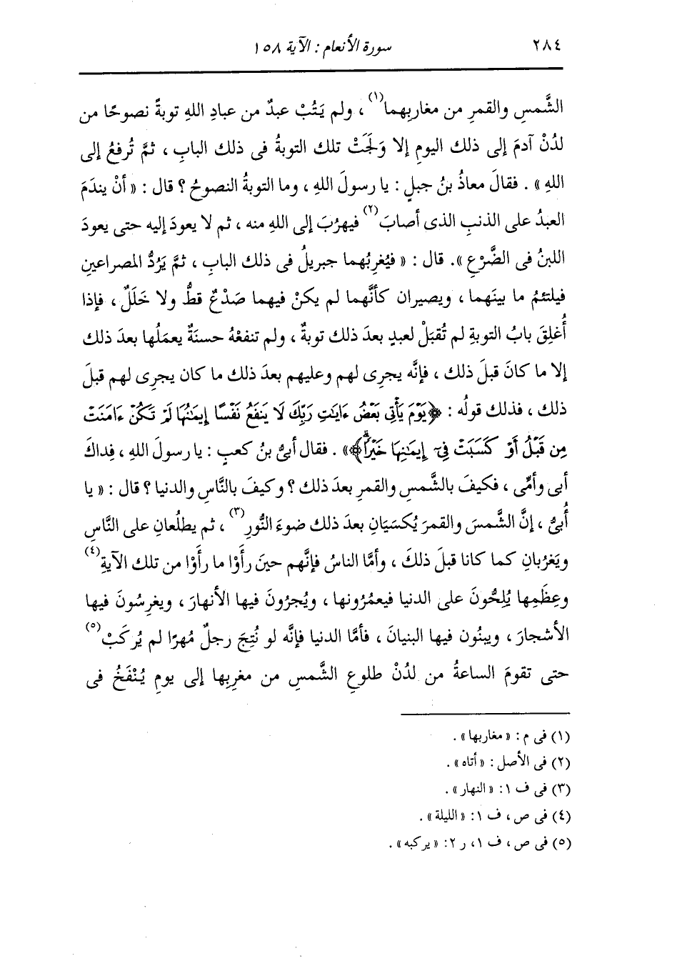 الشمس والقمر من مغاربها ولم يتب عبد من عباد الله توبة نصوحا من لدن آدم إلى ذلك اليوم إلا ولجت تلك التوبة في ذلك الباب ثم ترفع إلى الله فقال معاذ بن جبل : يا رسول الله وما التوبة النصوح قال : أن يندم العبد على الذنب الذي أصاب فيهرب إلى الله منه ثم لا يعود إليه حتى يعود اللبن في الضرع ، قال : فيغربهما جبريل في ذلك الباب ثم يرد المصراعين فيلتئم ما بينهما ويصيران كأنهما لم يكن فيهما صدع قط ولا خلل فإذا أغلق باب التوبة لم تقبل لعبد بعد ذلك توبة ولم تنفعه حسنة يعملها بعد ذلك إلا ما كان قبل ذلك فإنه يجري لهم وعليهم بعد ذلك ما كان يجري لهم قبل ذلك فذلك قوله تعالى {يوم يأتي بعض آيات ربك لا ينفع نفسا إيمانها لم تكن آمنت من قبل أو كسبت في إيمانها خيرا} ، فقال أبي بن كعب : يا رسول الله فداك أبي وأمي فكيف بالشمس والقمر بعد ذلك وكيف بالناس والدنيا ، قال : يا أبي إن الشمس والقمر يكسيان بعد ذلك ضوء النور ثم يطلعان على الناس ويغربان كما كانا قبل ذلك وأما الناس فإنهم حين رأوا ما رأوا من تلك الآية وعظمها يلحون على الدنيا فيعمرونها ويجرون فيها الأنهار ويغرسون فيها الأشجار ويبنون فيها البنيان فأما الدنيا فإنه لو نتج رجل مهرا لم يركب حتى تقوم الساعة من لدن طلوع الشمس من مغربها إلى يوم ينفخ في