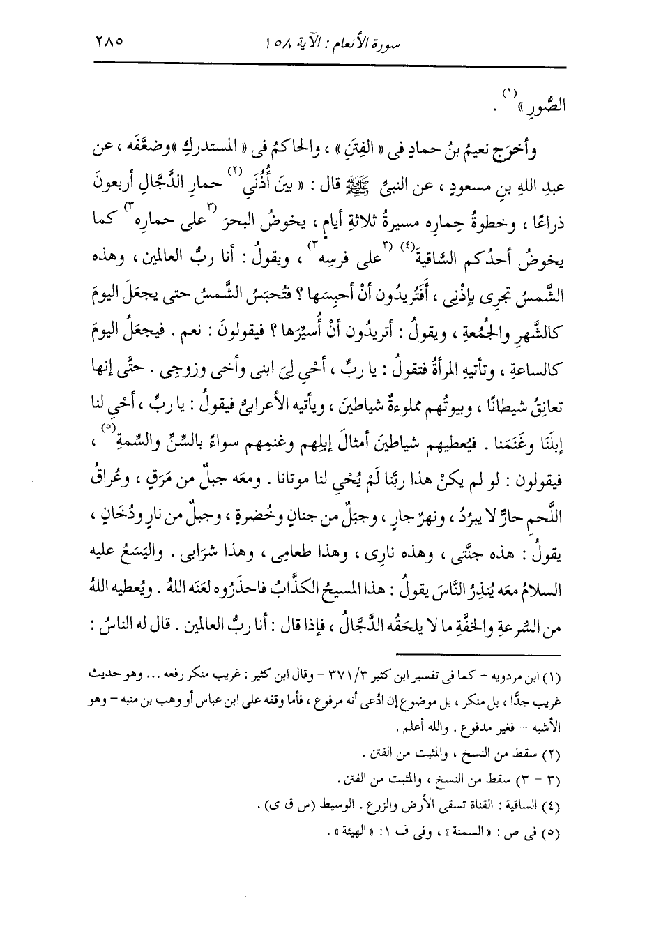 وأخرج نعيم بن حماد في الفتن والحاكم في المستدرك وضعفه عن عبد الله بن مسعود عن النَّبِيّ صلى الله عليه وسلم قال بين أذني الدجال أربعون ذراعا وخطوة حماره مسيرة ثلاثة أيام يخوض البحر كما يخوض أحدكم الساقية ويقول : أنا رب العالمين وهذه الشمس تجري بإذني أتريدون أن أحبسها فتحبس الشمس حتى يجعل اليوم كالشهر والجمعة ويقول : أتريدون أن أسيرها فيقولون : نعم ، فيجعل اليوم كالساعة وتأتيه المرأة فتقول : يا رب احي لي أخي وابني وزوجي حتى أنها تعانق شيطانا وبيوتهم مملوءة شياطين ويأتيه الأعرابي فيقول : يا رب أحي لنا إبلنا