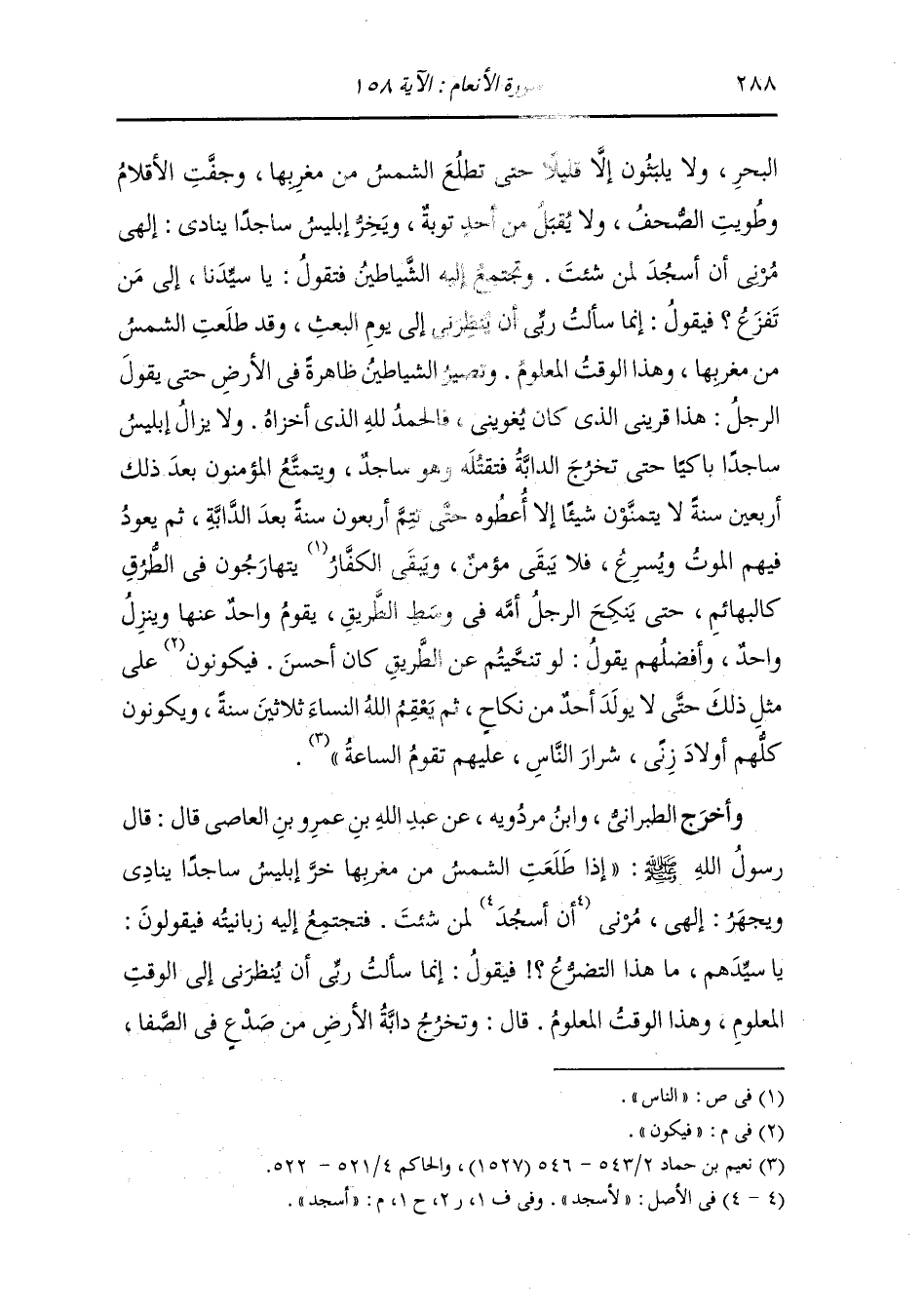 وأخرج الطبراني ، وَابن مردويه عن عبد الله بن عمرو بن العاص قال : قال رسول الله صلى الله عليه وسلم إذا طلعت الشمس من مغربها خر إبليس ساجدا ينادي ويجهر : إلهي مرني أسجد لمن شئت فتجتمع إليه زبانيته فيقولون : يا سيدهم ما هذا التضرع فيقول : إنما سألت ربي أن ينظرني إلى الوقت المعلوم وهذا الوقت المعلوم ، قال :