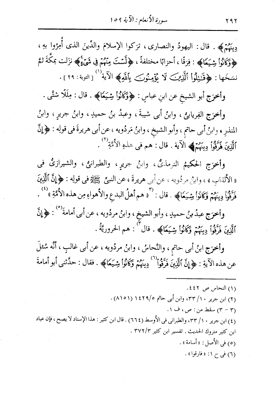 وأخرج ابن أبي حاتم والنحاس ، وَابن مردويه عن أبي غالب أنه سئل عن هذه الآية {إن الذين فرقوا دينهم وكانوا شيعا} فقال : حدثني أبو أمامة