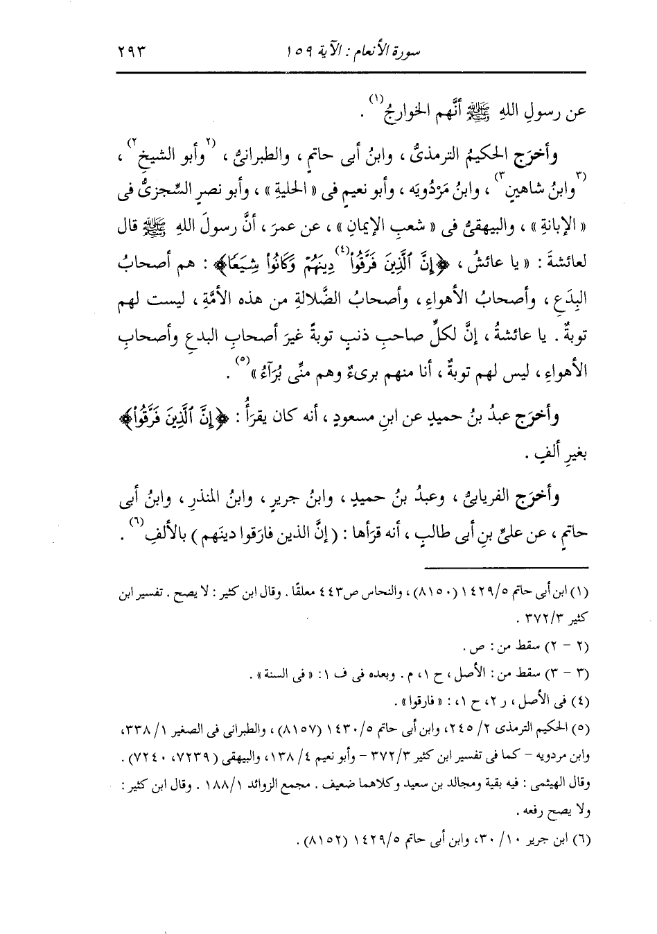 وأخرج الحكيم الترمذي ، وَابن أبي حاتم وأبو الشيخ والطبراني وأبو نعيم في الحلية ، وَابن مردويه وأبو نصر السجزي في الابانة والبيهقي في شعب الإيمان عن عمر بن الخطاب أن رسول الله صلى الله عليه وسلم قال لعائشة : يا عائشة {إن الذين فرقوا دينهم وكانوا شيعا} هم أصحاب البدع وأصحاب الأهواء وأصحاب الضلالة من هذه الأمة ليست لهم توبة يا عائشة إن لكل صاحب ذنب توبة غير أصحاب البدع وأصحاب الأهواء ليس لهم توبة أنا منهم بريء وهم مني براء.