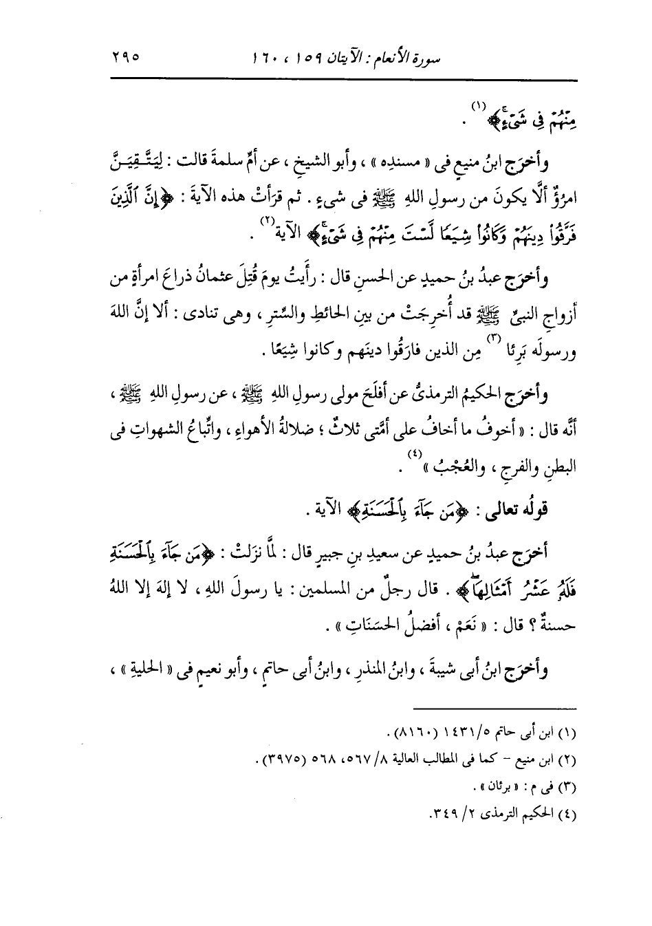 وأخرج ابن منيع في مسنده وأبو الشيخ عن أم سلمة قالت : ليتقين امرؤ أن لا يكون من رسول الله صلى الله عليه وسلم في شيء ثم قرأت هذه الآية {إن الذين فرقوا دينهم وكانوا شيعا لست منهم في شيء} الآية.