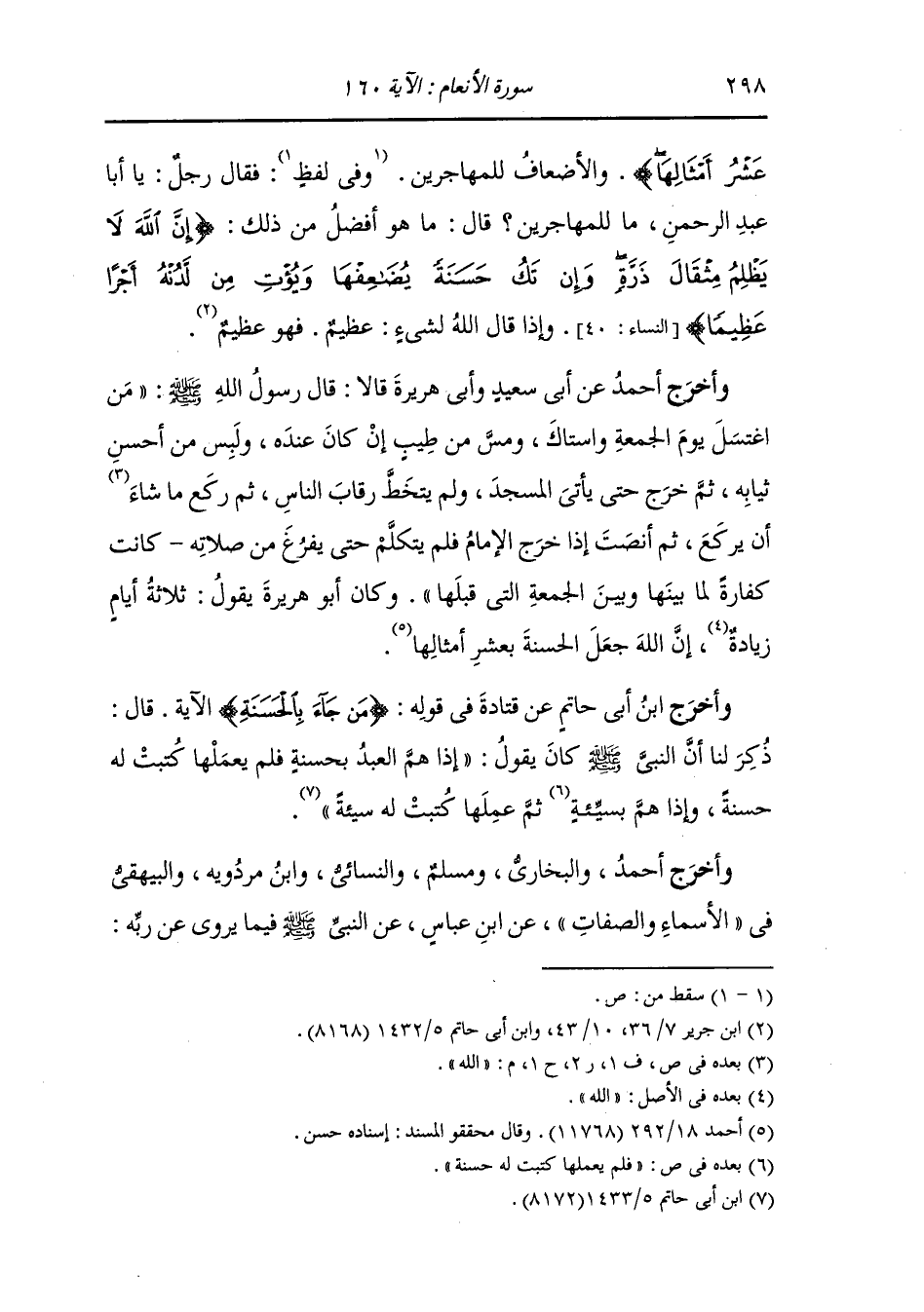 عشر أمثالها} والأضعاف للمهاجرين ، وفي لفظ : فقال رجل : يا أبا عبد الرحمن ما للمهاجرين قال : ما هو أفضل من ذلك {إن الله لا يظلم مثقال ذرة وإن تك حسنة يضاعفها ويؤت من لدنه أجرا عظيما} النساء الآية 41 وإذا قال الله لشيء عظيم فهو عظيم.