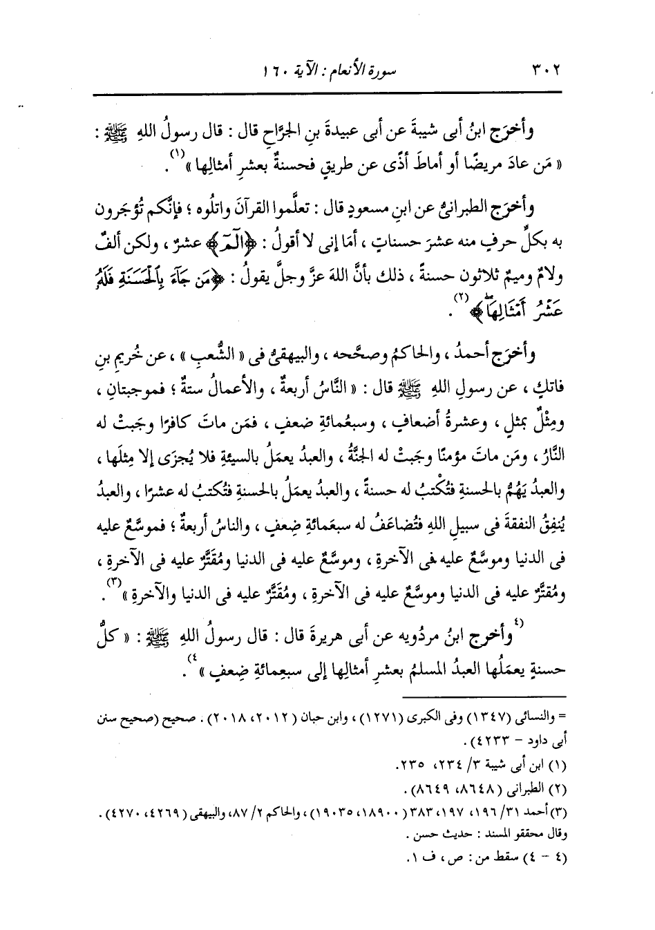 وأخرج ابن أبي شيبة عن أبي عبيدة بن الجراح قال : قال رسول الله صلى الله عليه وسلم من عاد مريضا أو أماط أذى عن طريق فحسنة بعشر أمثالها.