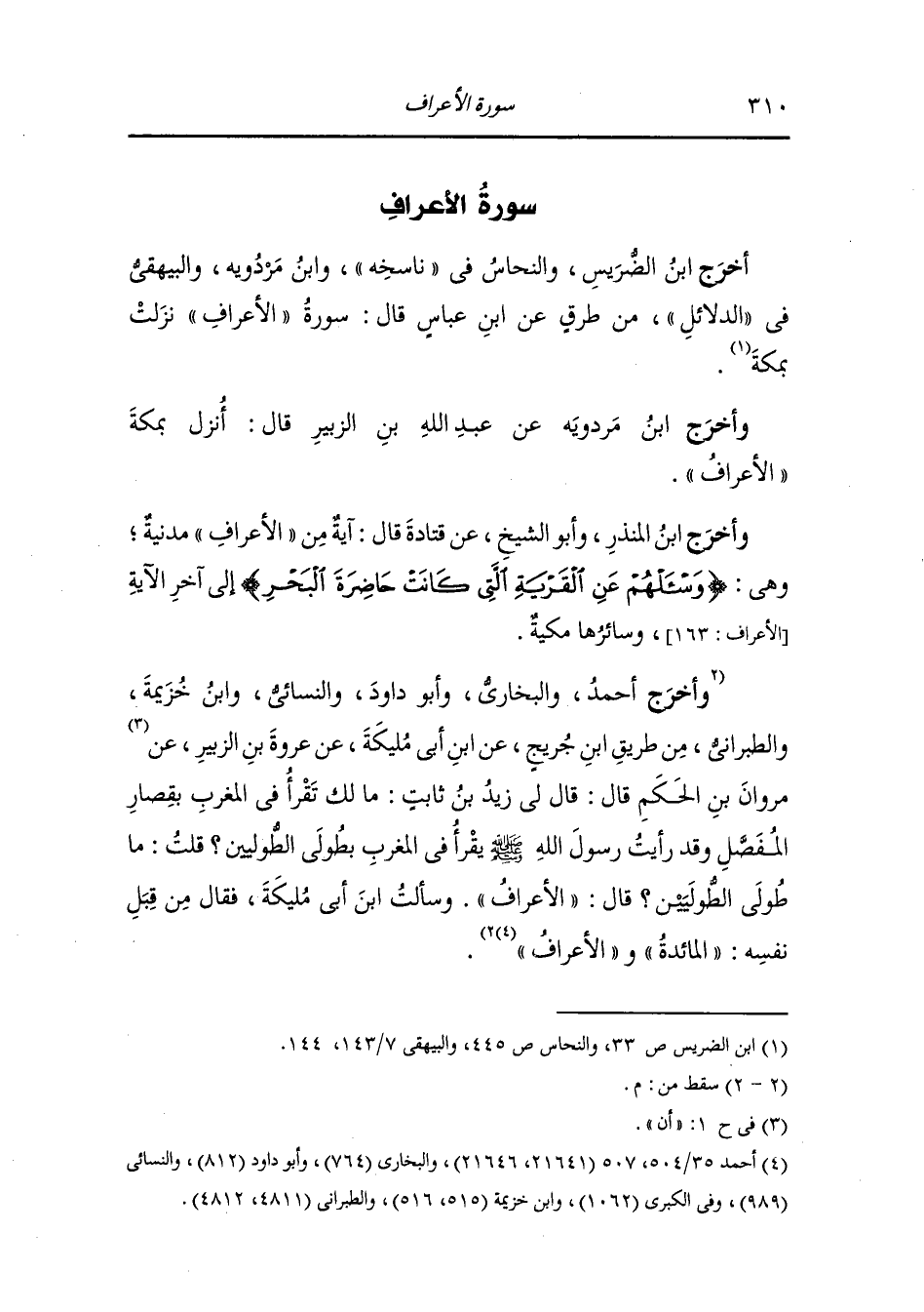 وَأخرَج أحمد والبخاري وأبو داود والنسائي ، وَابن خزيمة والطبراني من طريق ابن جريج عن ابن أبي ملكة عن عروة بن الزبير عن مروان بن الحكم قال : قال لي زيد بن ثابت : ما لك تقرأ في المغرب بقصار المفصل وقد رأيت رسول الله صلى الله عليه وسلم يقرأ المغرب بطولى الطوليين ؟ قلت : ما طولى الطوليين ؟ قال : الأعراف" . وسألت ابن أبي مليكة فقال من قبل نفسه : المائدة " و" الأعراف .