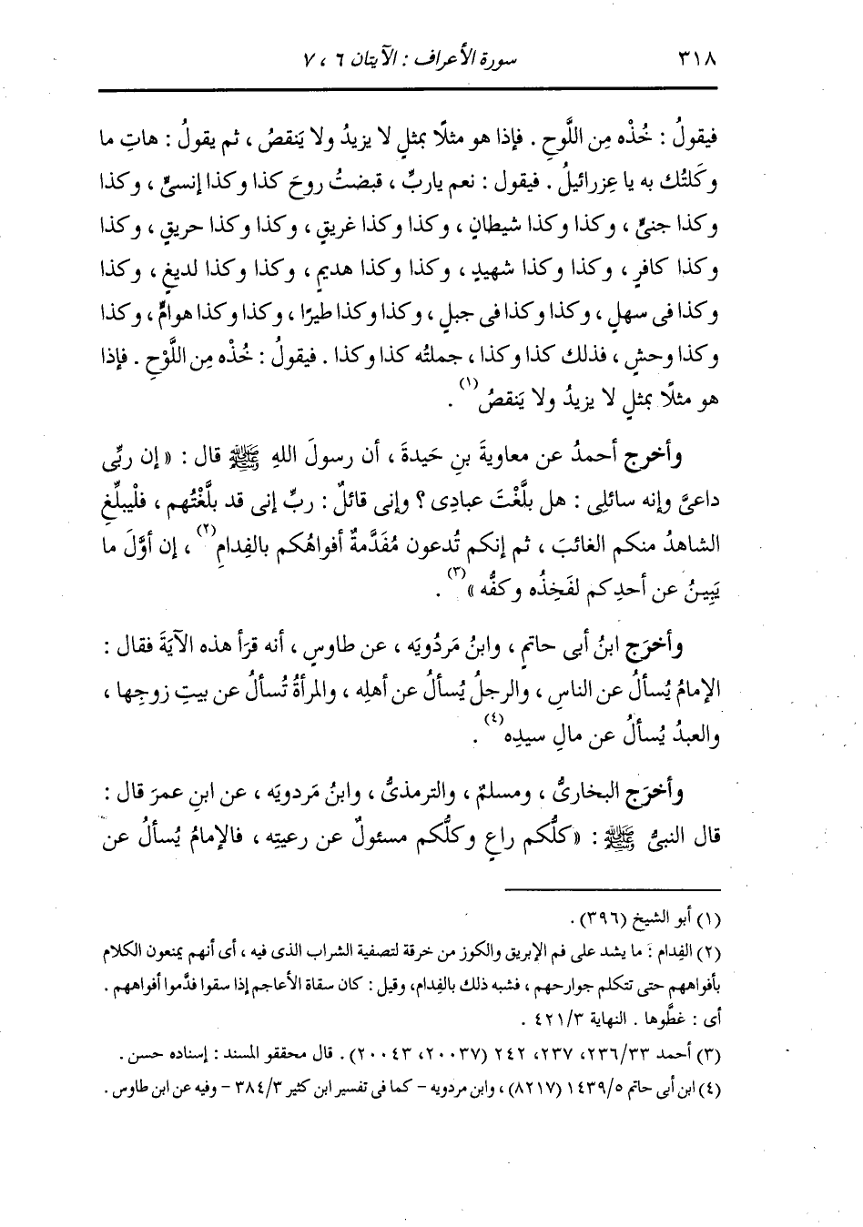 وأخرج أحمد عن معاوية بن حيدة أن رسول الله صلى الله عليه وسلم قال : إن ربي داعي وإنه سائلي هل بلغت عبادي وإني قائل رب إني قد بلغتهم فليبلغ الشاهد منكم الغائب ثم إنكم تدعون مفدمة أفواهكم بالفدام إن أول ما يبين عن أحدكم لفخذه وكفه.