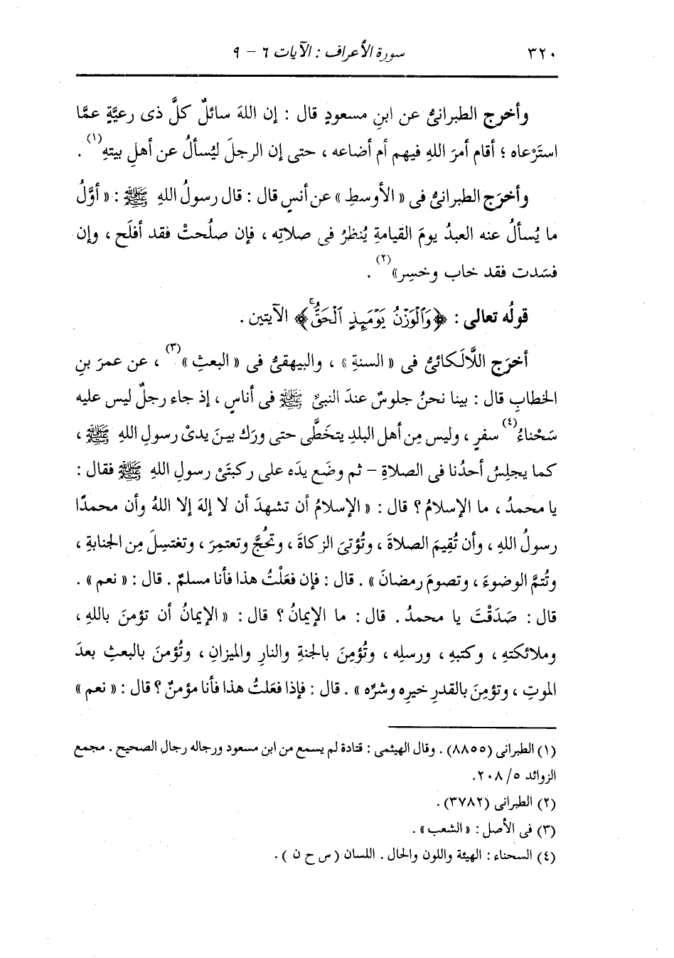 - أَخْرَج اللالكائي في السنة والبيهقي في البعث عن عمر بن الخطاب قال بينا نحن جلوس عند النَّبِيّ صلى الله عليه وسلم في أناس إذ جاء رجل ليس عليه سحناء سفر وليس من أهل البلد يتخطى حتى ورك بين يدي رسول الله صلى الله عليه وسلم كما يجلس أحدنا في الصلاة ثم وضع يده على ركبتي رسول الله صلى الله عليه وسلم فقال : يا محمد ما الإسلام قال : الإسلام أن تشهد أن لا إله إلا الله وأن محمد رسول الله وأن تقيم الصلاة وتؤتي الزكاة وتحج وتعتمر وتغتسل من الجنابة وتتم الوضوء وتصوم رمضان ، قال : فإن فعلت هذا فأنا مسلم قال : نعم ، قال : صدقت يا محمد قال : ما الإيمان قال : الإيمان أن تؤمن بالله وملائكته وكتبه ورسله وتؤمن بالجنة والنار والميزان وتؤمن بالبعث بعد الموت وتؤمن بالقدر خيره وشره ، قال : فإذا فعلت هذا فأنا مؤمن قال : نعم ، قال : صدقت