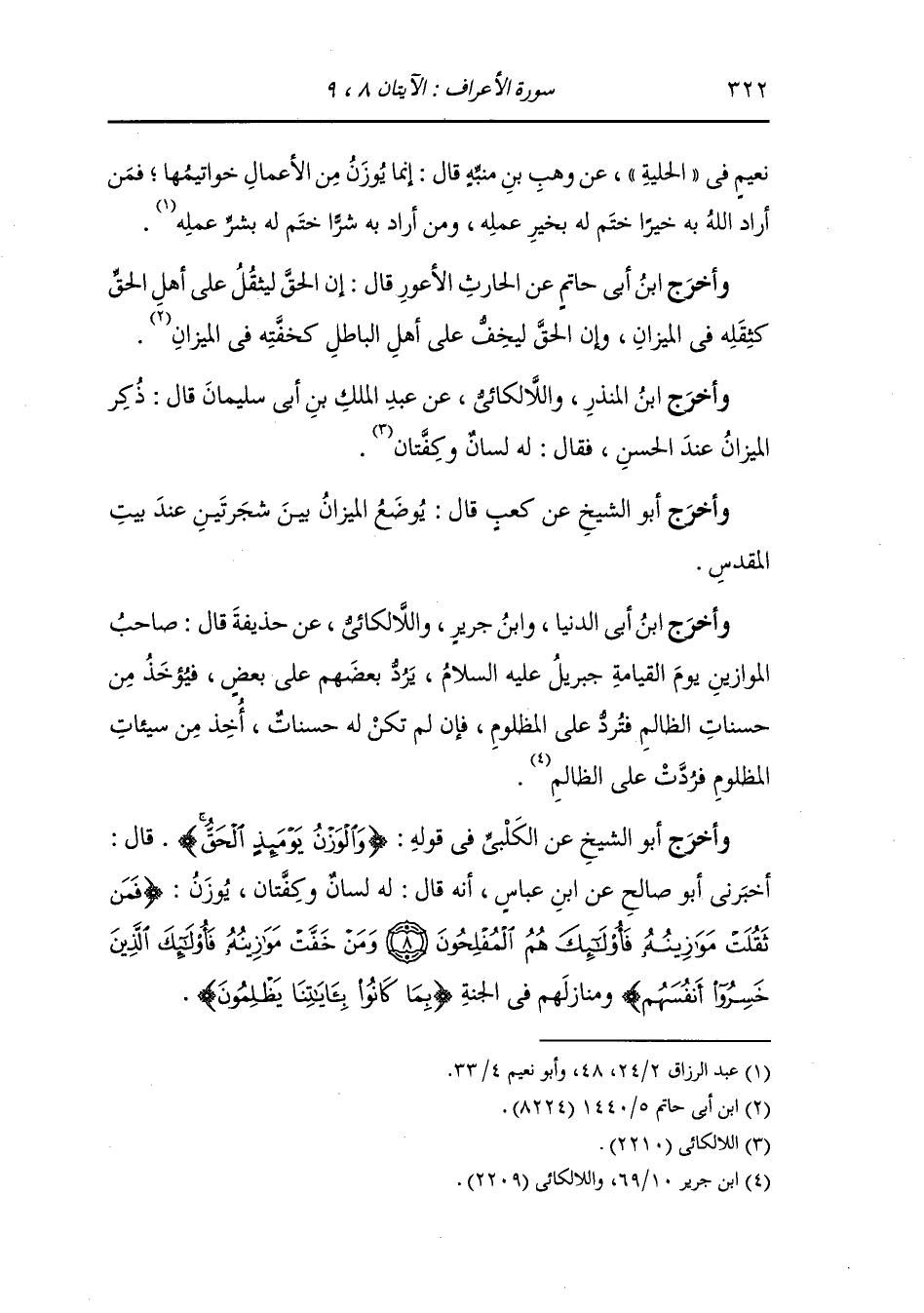 وأخرج ابن أبي الدنيا ، وَابن جَرِير واللالكائي عن حذيفة قال : صاحب الموازين يوم القيامة جبريل عليه السلام يرد بعضهم على بعض فيؤخذ من حسنات الظالم فترد على المظلوم فإن لم تكن له حسنات أخذ من سيئات المظلوم فردت على الظالم.