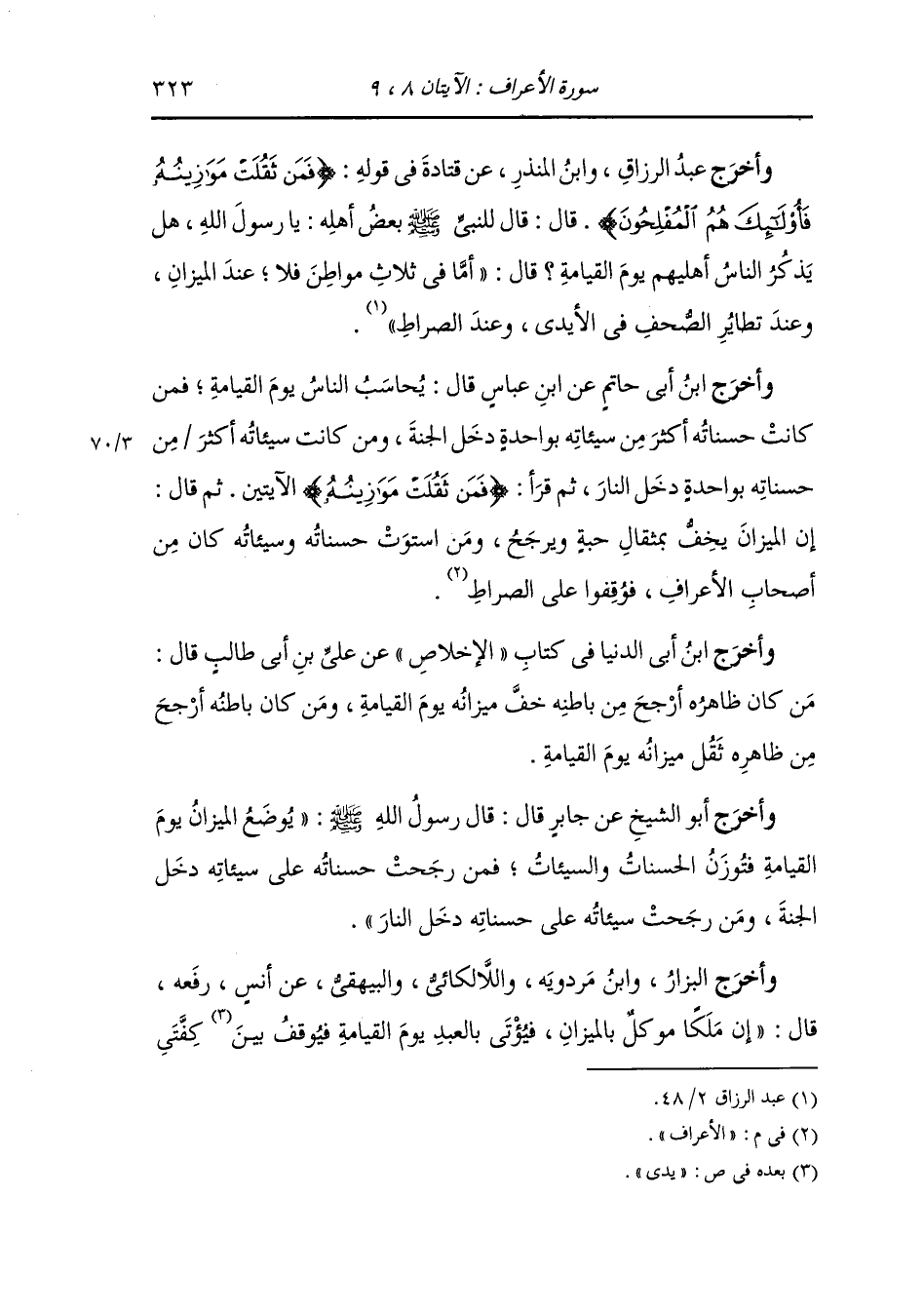 وأخرج عبد الرزاق ، وَابن المنذر عن قتادة في قوله {فمن ثقلت موازينه فأولئك هم المفلحون} قال : قال للنبي صلى الله عليه وسلم بعض أهله : يا رسول الله هل يذكر الناس أهليهم يوم القيامة قال أما في ثلاث مواطن فلا ، عند الميزان وعند تطاير الصحف في الأيدي وعند الصراط.