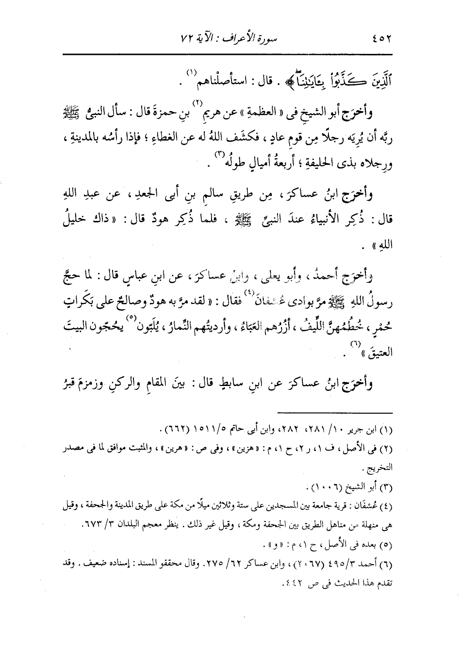 وأخرج أحمد وأبو يعلى ، وَابن عساكر عن ابن عباس قال : لما حج رسول الله صلى الله عليه وسلم مر بوادي عسفان فقال لقد مر به هود وصالح على بكرات حمر خطمهن الليف ازرهم العباء وأرديتهم النمار يلبون ويحجون البيت العتيق.
