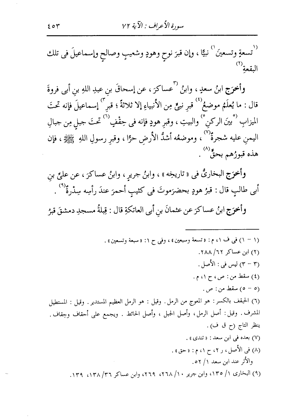 وَأَخرَج ابن سعد ، وَابن عساكر عن إسحاق بن عبد الله بن أبي فروة قال : ما يعلم قبر نبي من الأنبياء إلا ثلاثة 0 قبر إسمعيل فإنه تحت الميزاب بين الركن والبيت وقبر هود فإنه في حقف تحت جبل من جبال اليمن عليه شجرة وموضعه أشد الأرض حرا وقبر رسول الله صلى الله عليه وسلم فإن هذه قبورهم حق.