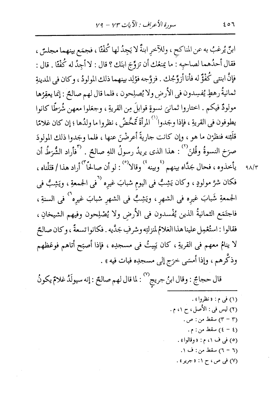 لصاحبه ما يمنعك أن تزوج ابنك قال : لا أجد له كفؤا قال : فإن ابنتي كفء له فأنا أزوجك ، فزوجه فولد بينهما مولود ، وكان في المدينة ثمانية رهط يفسدون في الأرض ولا يصلحون فلما قال لهم صالح : إنما يعقرها مولود فيكم ، اختاروا ثماني نسوة قوابل من القرية وجعلوا معهن شرطا كانوا يطوفون في القرية فإذا نظروا المرأة تمخض نظروا ما ولدها إن كان غلاما قلبنه فنظرن ما هو وإن كانت جارية أعرضن عنها ، فلما وجدوا ذلك المولود صرخت النسوة : هذا الذي يريد صالح رسول الله فأراد الشرط أن يأخذوه فحال جداه بينهم وقالوا : لو أن صالحا أراد هذا قتلناه فكان شر مولود وكان يشب في اليوم شباب غيره في الجمعة ويشب في الجمعة شباب غيره في الشهر ويشب في الشهر شباب غيره في السنة فاجتمع الثمانية الذين يفسدون في الأرض ولا يصلحون وفيهم الشيخان فقالوا : استعمل علينا هذا الغلام لمنزلته وشرف جديه فكانوا تسعة وكان صالحا لا ينام معهم في القرية كان يبيت في مسجده فإذا أصبح أتاهم فوعظهم وذكرهم وإذا أمسى خرج إلى مسجده فبات فيه ، قال حجاج وقال ابن جريج : لما قال لهم صالح : أنه سيولد غلام يكون