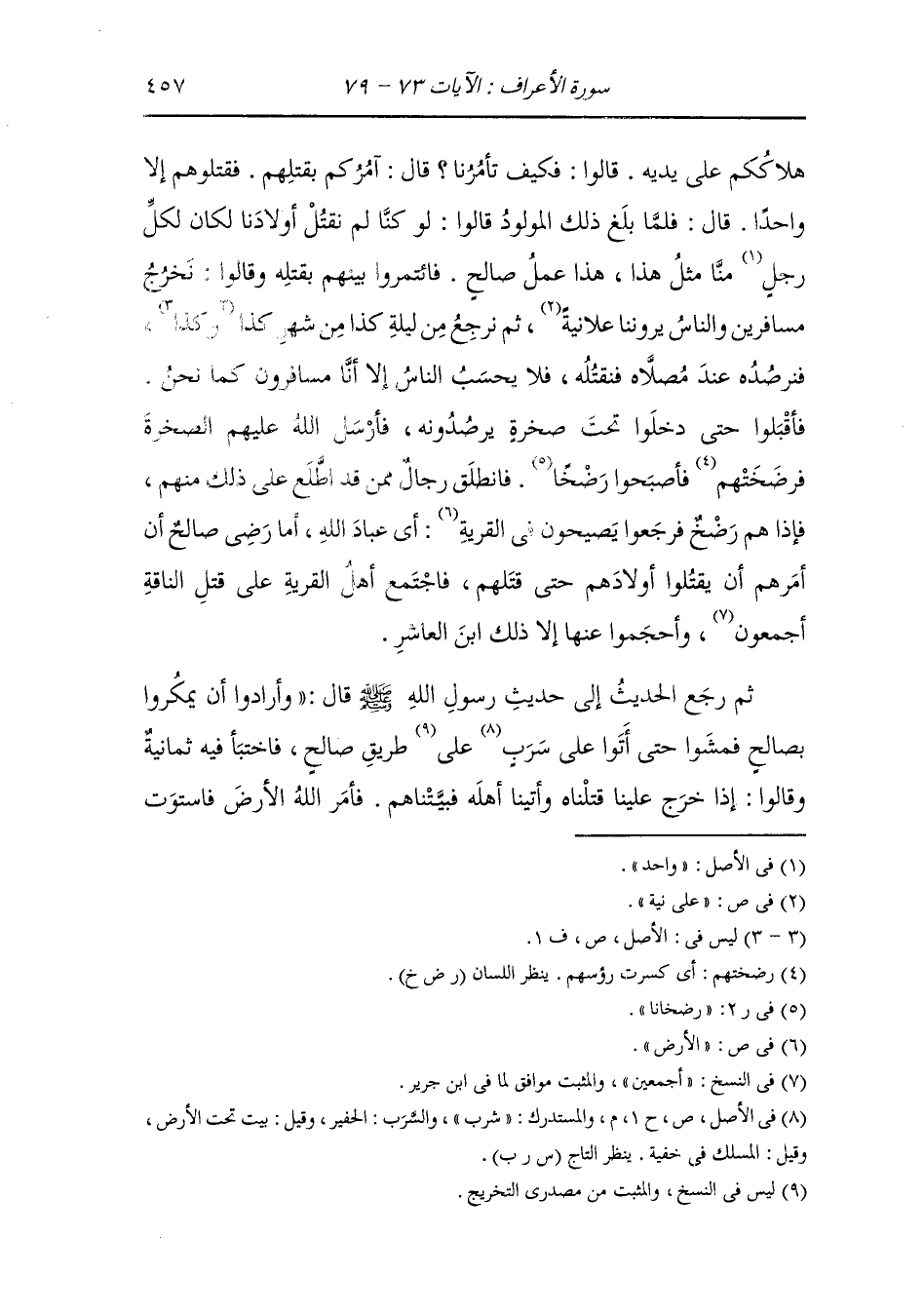 هلاككم على يديه قالوا : فكيف تأمرنا قال : آمركم بقتلهم : فقتلوهم إلا واحدا قال : فلما بلغ ذلك المولود قالوا : لو كنا لم نقتل أولادنا لكان لكل رجل منا مثل هذا هذا عمل صالح فأتمروا بينهم بقتله وقالوا : نخرج مسافرين والناس يروننا علانية ثم نرجع من ليلة كذا من شهر كذا وكذا فنرصده عند مصلاه فنقتله فلا يحسب الناس إلا أنا مسافرون كما نحن فأقبلوا حتى دخلوا تحت صخرة يرصدونه فأرسل الله عليهم الصخرة فرضختهم فأصبحوا رضخا فانطلق رجال ممن قد اطلع على ذلك منهم فإذا هم رضخ فرجعوا يصيحون في القرية : أي عباد الله أما رضي صالح أن أمرهم أن يقتلوا أولادهم حتى قتلهم فاجتمع أهل القرية على قتل الناقة أجمعين وأحجموا عنها إلا ذلك ابن العاشر ، ثم رجع الحديث إلى حديث رسول الله صلى الله عليه وسلم قال : وأرادوا أن يمكروا بصالح فمشوا حتى أتوا على شرب طريق صالح فاختبأ فيه ثمانية وقالوا : إذا خرج علينا قتلناه وأتينا أهله فبيتناهم فأمر الله الأرض فاستوت