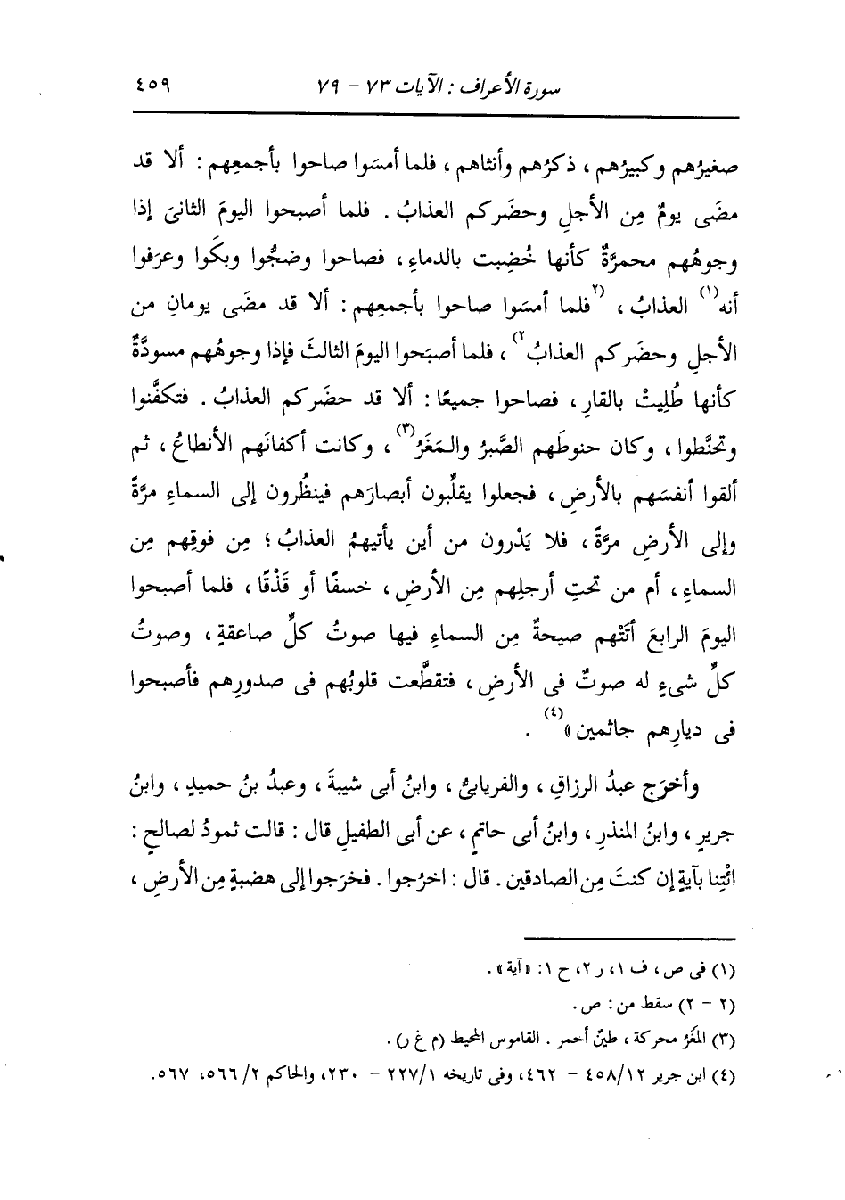 صغيرهم وكبيرهم ذكرهم وأنثاهم فلما أمسوا صاحوا بأجمعهم ألا قد مضى يوم من الأجل وحضركم العذاب فلما أصبحوا اليوم الثاني إذا وجوههم محمرة كأنها خضبت بالدماء فصاحوا وضجوا وبكوا وعرفوا أنه العذاب فلما أمسوا صاحوا بأجمعهم ألا قد مضى يومان من الأجل وحضركم العذاب فلما أصبحوا اليوم الثالث فإذا وجوههم مسودة كأنها طليت بالقار فصاحوا جميعا ألا قد حضركم العذاب فتكفنوا وتحنطوا ، وكان حنوطهم الصبر والمغر وكانت أكفانهم الانطاع ثم ألقوا أنفسهم بالأرض فجعلوا يقلبون أبصارهم فينظرون إلى السماء مرة وإلى الأرض مرة فلا يدرون من أين يأتيهم العذاب من فوقهم من السماء أم من تحت أرجلهم من الأرض خسفا أو قذفا فلما أصبحوا اليوم الرابع أتتهم صيحة من السماء فيها صوت كل صاعقة وصوت كل شيء له صوت في الأرض فتقطعت قلوبهم في صدورهم فأصبحوا في ديارهم جاثمين.
