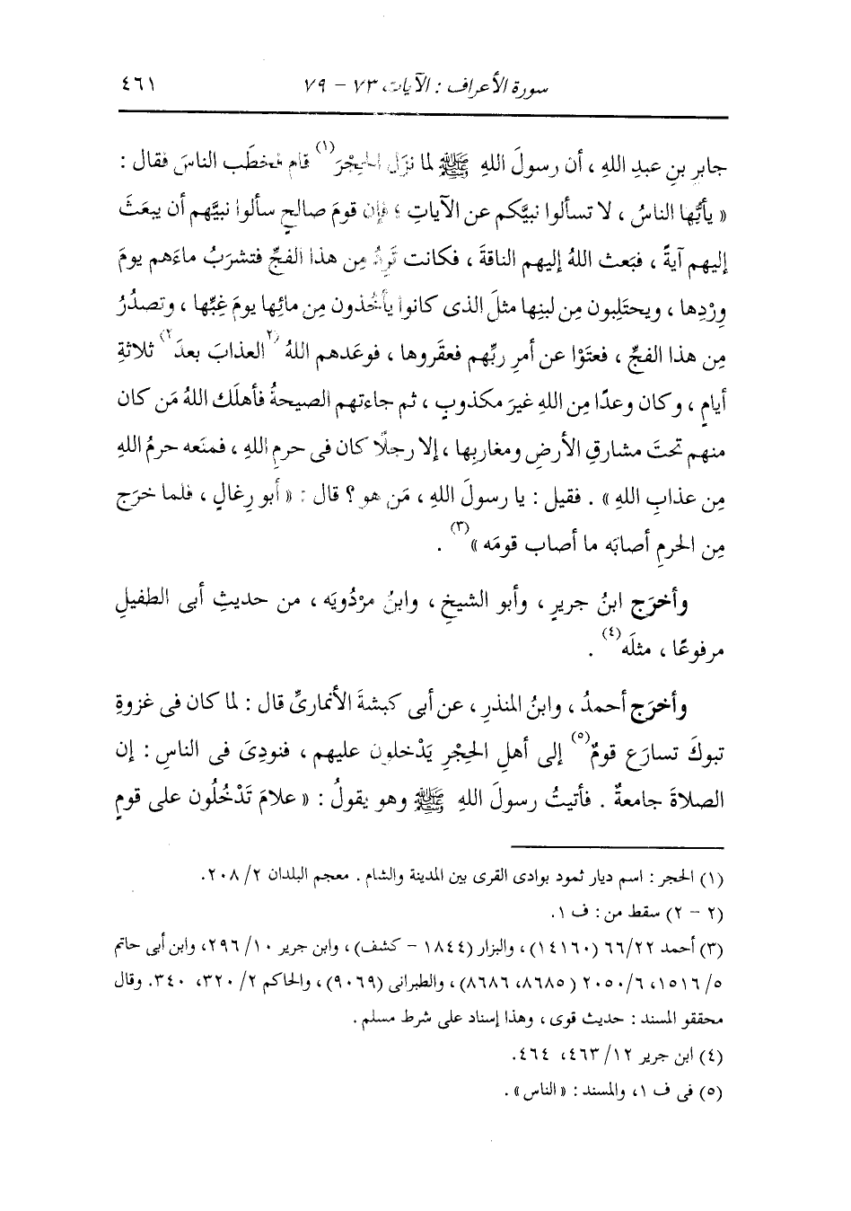جابر بن عبد الله أن رسول الله صلى الله عليه وسلم لما نزل الحجر قام فخطب الناس فقال : يا أيها الناس لا تسألوا نبيكم عن الآيات فإن قوم صالح سألوا نبيهم أن يبعث إليهم آية فبعث الله إليهم الناقة فكانت ترد من هذا الفج فتشرب ماءهم يوم وردها ويحتلبون من لبنها مثل الذي كانوا يأخذون من مائها يوم غبها وتصدر من هذا الفج فعتوا عن أمر ربهم فعقروها فوعدهم الله العذاب بعد ثلاثة أيام وكان وعدا من الله غير مكذوب ثم جاءتهم الصيحة فأهلك الله من كان منهم تحت مشارق الأرض ومغاربها إلا رجلا كان في حرم الله فمنعه حرم الله من عذاب الله ، فقيل : يا رسول الله من هو قال : أبو رغال ، فلما خرج من الحرم أصابه ما أصاب قومه.