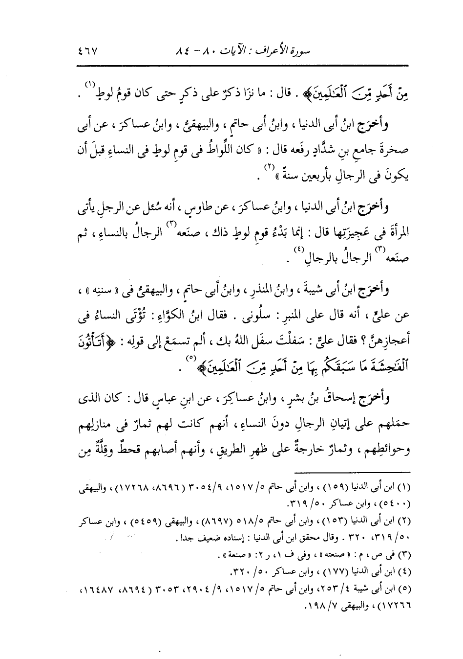 وأخرج ابن أبي الدنيا ، وَابن أبي حاتم والبيهقي ، وَابن عساكر عن أبي صخرة جامع بن شداد رفعه قال كان اللواط في قوم لوط في النساء قبل أن يكون في الرجال بأربعين سنة.