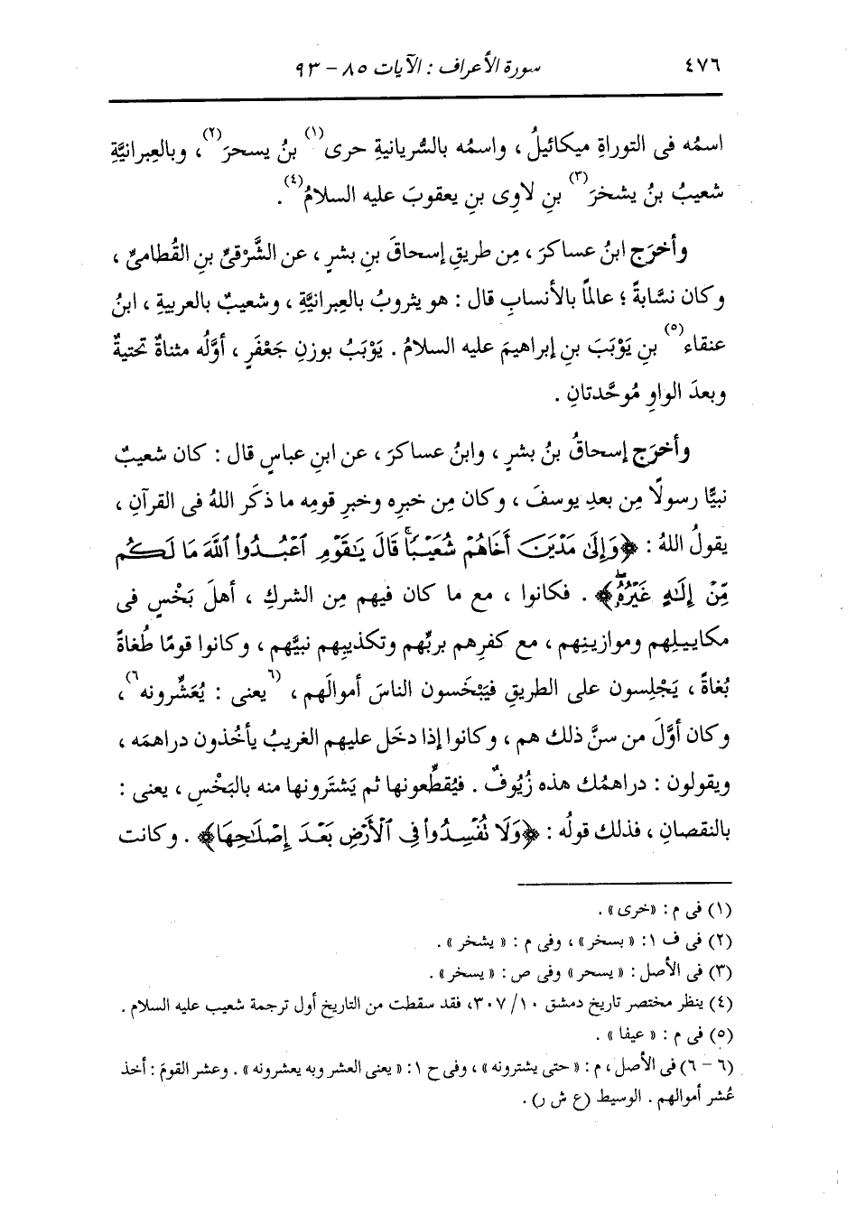 وأخرج ابن عساكر من طريق إسحاق بن بشر عن الشرقي بن القطامي وكان نسابة عالما بالأنساب قال : هو ثيروب بالعبرانية وشعيب بالعربية ابن عيفا بن يوبب بن إبراهيم عليه الصلاة والسلام ، يوبب بوزن جعفر أوله مثناه تحيتة وبعد الواو موحدتان.