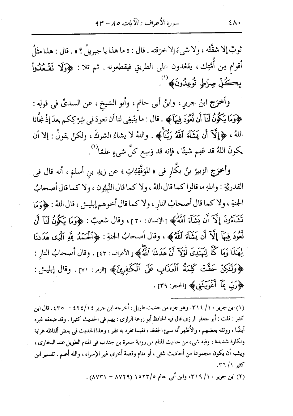 وأخرج الزبير بن بكار في الموفقيات عن زيد بن أسلم : أنه قال في القدرية والله ما قالوا كما قال الله ولا كما قال النبيون ولا كما قال أصحاب الجنة ولا كما قال أصحاب النار ولا كما قال أخوهم إبليس ، قال الله {وما تشاؤون إلا أن يشاء الله} الإنسان الآية 30 وقال شعيب {وما يكون لنا أن نعود فيها إلا أن يشاء الله} وقال أصحاب الجنة {الحمد لله الذي هدانا لهذا وما كنا لنهتدي لولا أن هدانا الله} الأعراف الآية 43 وقال أصحاب النار {ولكن حقت كلمة العذاب على الكافرين} الزمر الآية 71 وقال إبليس {رب بما أغويتني} الحجر الآية 39