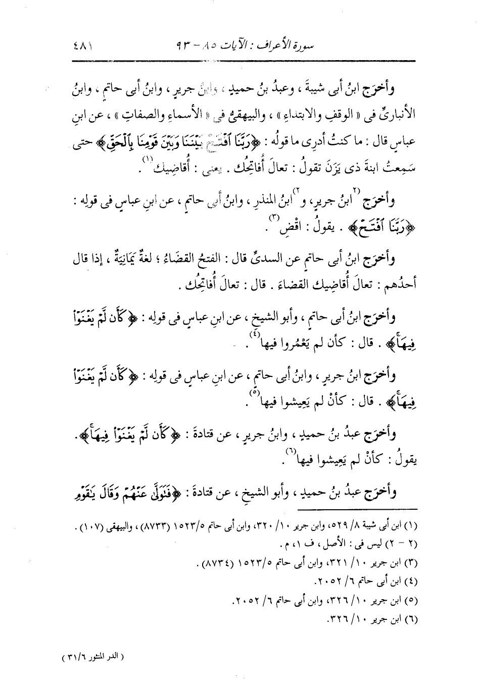 وأخرج ابن أبي شيبة ، وعَبد بن حُمَيد ، وَابن جَرِير ، وَابن أبي حاتم ، وَابن الأنباري في الوقف والإبتداء والبيهقي في الأسماء والصفات عن ابن عباس قال : ما كنت أدري ما قوله {ربنا افتح بيننا وبين قومنا بالحق} حتى سمعت ابنة ذي يزن تقول : تعال أفاتحك : يعني أقاضيك.