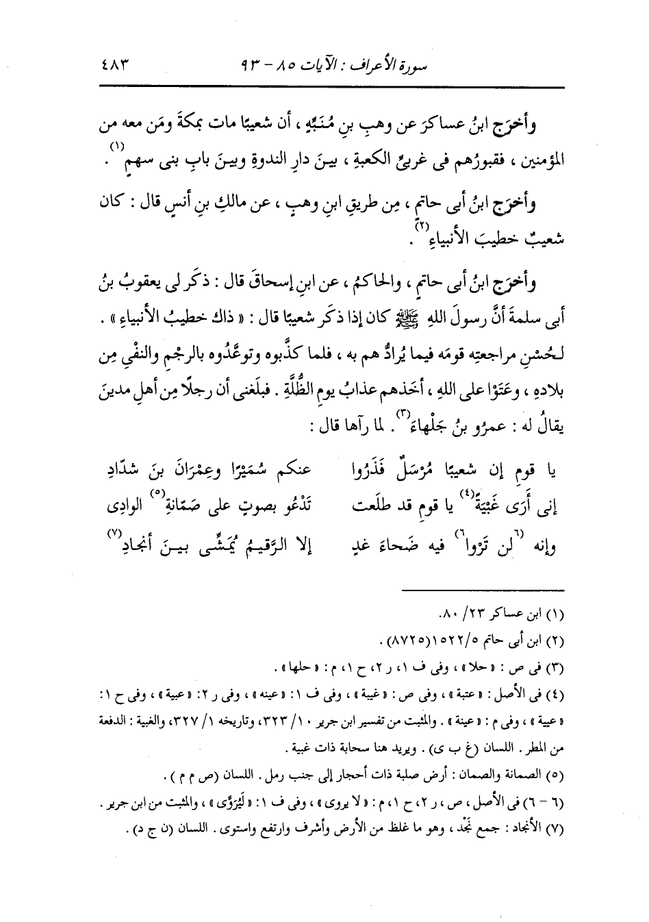 يا قوم إن شعيبا مرسل فذروا * عنكم سميرا وعمران بن شداد إني أرى عينة يا قوم قد طلعت * تدعو بصوت على صمانة الواد وإنه لا يروي فيه ضحى غد * إلا الرحيم يحشى بين أنجاد