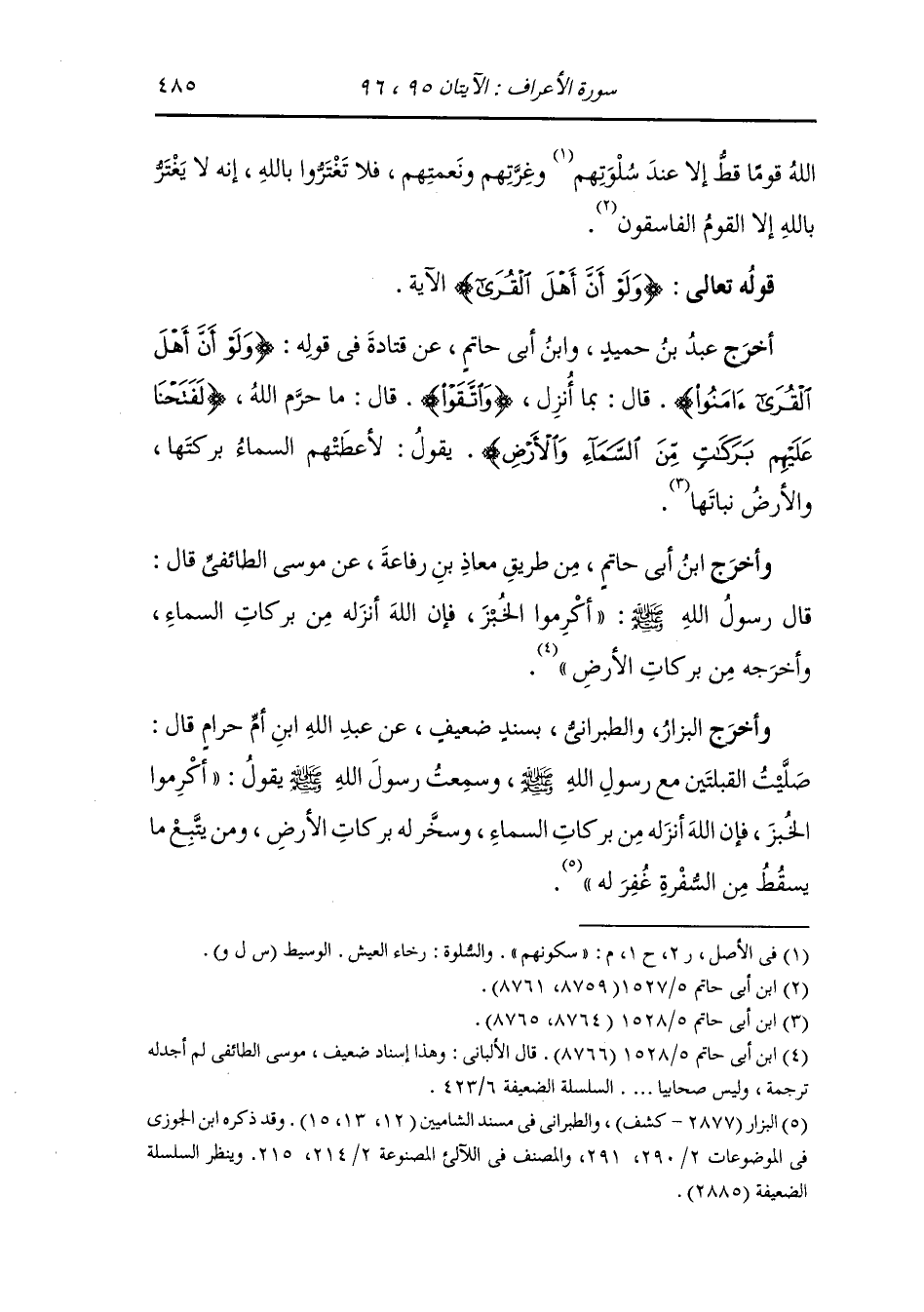 وأخرج ابن أبي حاتم من طريق معاذ بن رفاعة عن موسى الطائفي قال : قال رسول الله صلى الله عليه وسلم أكرموا الخبز فإن الله أنزله من بركات السماء وأخرجه من بركات الأرض.