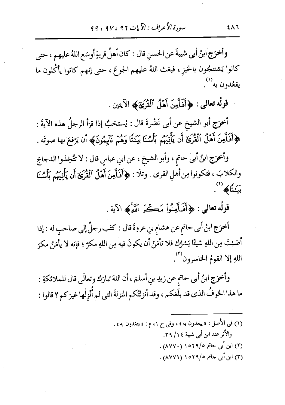 - أَخْرَج أبو الشيخ عن أبي نضرة قال : يستحب إذا قرأ الرجل هذه الآية {أفأمن أهل القرى أن يأتيهم بأسنا بياتا وهم نائمون} يرفع بها صوته.