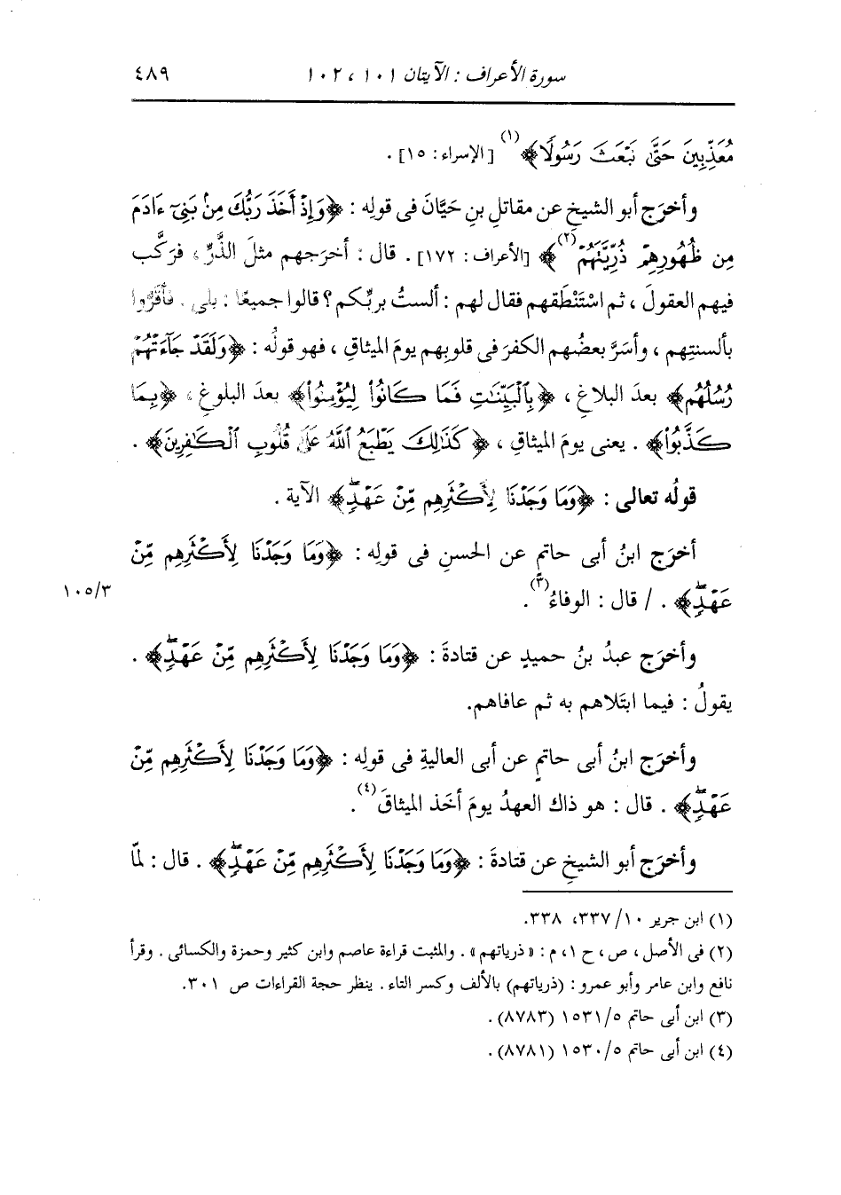 وأخرج الشيخ عن مقاتل بن حيان في قوله {وإذ أخذ ربك من بني آدم من ظهورهم ذريتهم} الأعراف الآية 172 قال : أخرجهم مثل الذر فركب فيهم العقول ثم استنطقهم فقال لهم {ألست بربكم} قالوا جميعا : بلى ، فأقروا بألسنتهم وأسر بعضهم الكفر في قلوبهم يوم الميثاق فهو قوله {ولقد جاءتهم رسلهم} بعد البلاغ {بالبينات فما كانوا ليؤمنوا} بعد البلوغ {بما كذبوا} يعني يوم الميثاق {كذلك يطبع الله على قلوب الكافرين}.