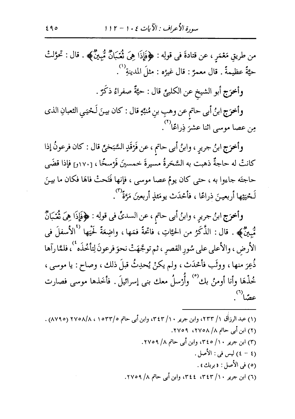 وأخرج ابن جرير ، وَابن أبي حاتم عن السدي في قوله {فإذا هي ثعبان مبين} قال : الذكر من الحيات فاتحة فمها واضعة لحيها الأسفل في الأرض والأعلى على سور القصر ثم توجهت نحو فرعون لتأخذه فلما رآها ذعر منها ووثب فأحدث ولم يكن يحدث قبل ذلك وصاح : يا موسى خذها وأنا أومن بك وأرسل معك بني إسرائيل ، فأخذها موسى فصارت عصا