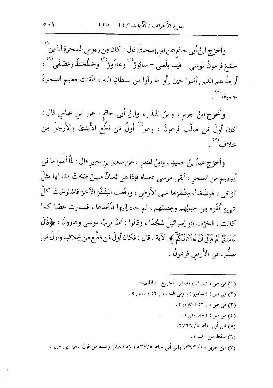 وأخرج ابن جرير ، وَابن المنذر ، وَابن أبي حاتم عن ابن عباس قال : كان أول من صلب فرعون وهو أول من قطع الأيدي والأرجل من خلاف.