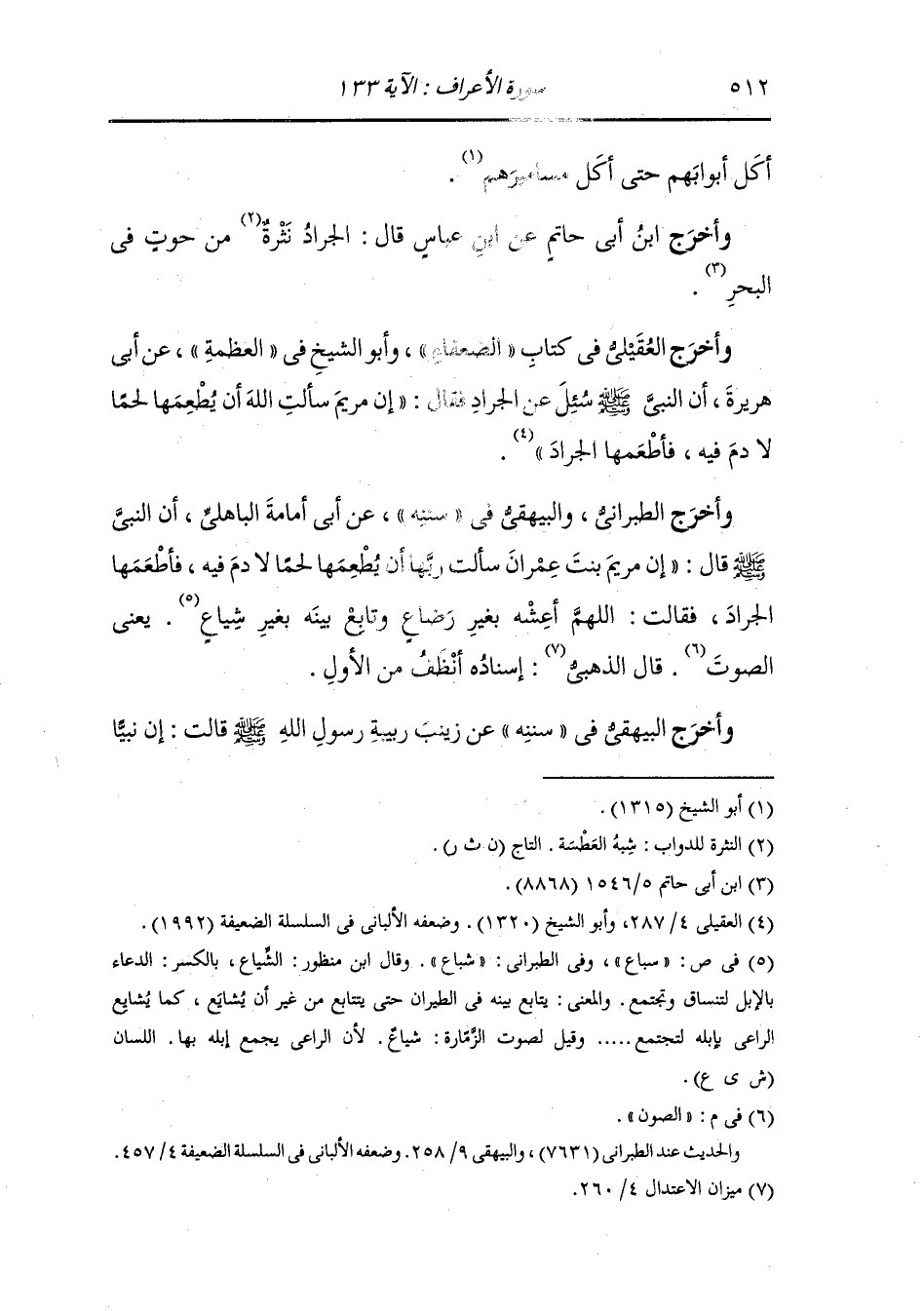 وأخرج العقيلي في كتاب الضعفاء وأبو الشيخ في العظمة عن أبي هريرة أن النَّبِيّ صلى الله عليه وسلم سئل عن الجراد فقال : إن مريم سألت الله أن يطعمها لحما لا دم فيه فأطعمها الجراد.
