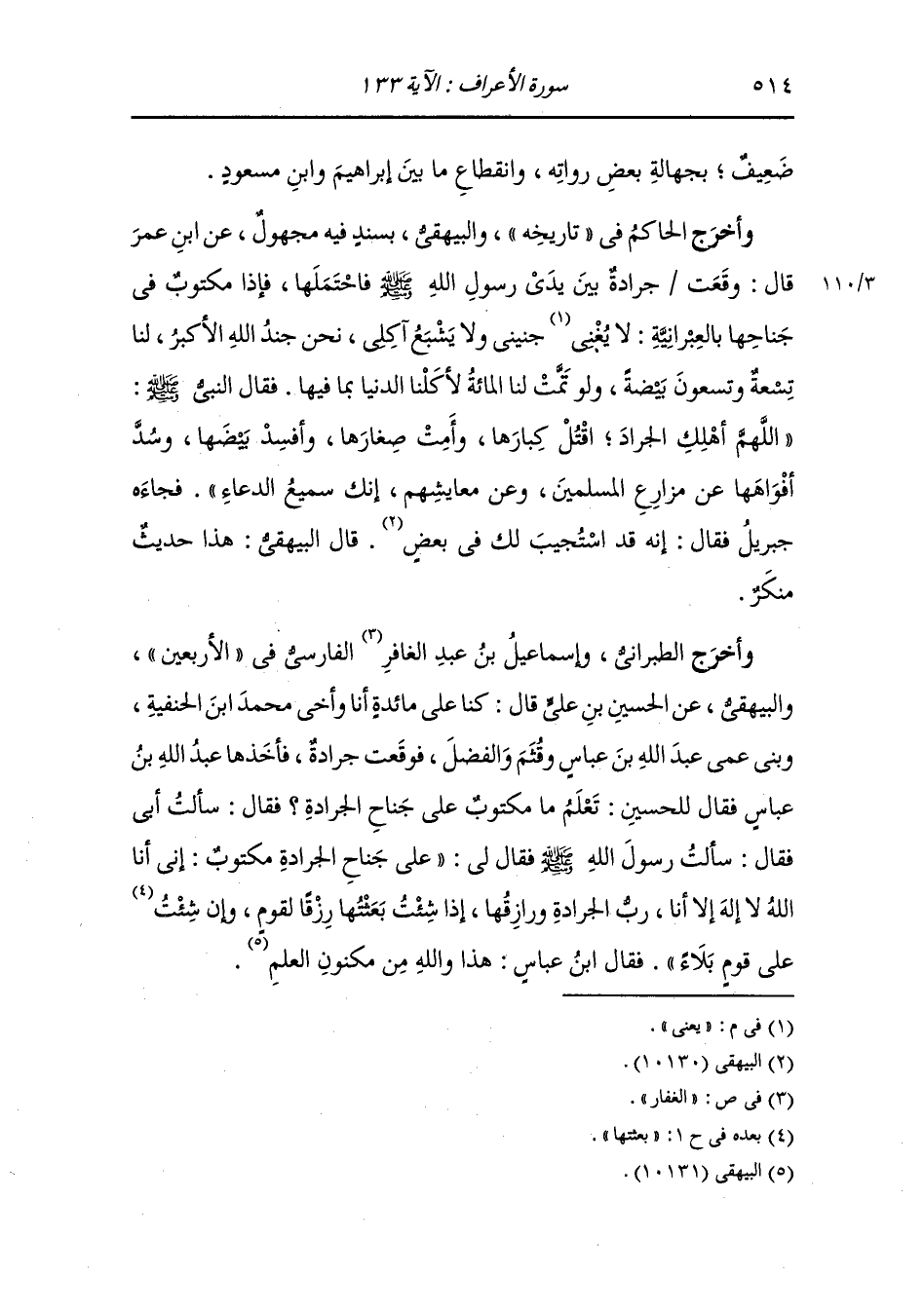 وأخرج الحاكم في تاريخه والبيهقي بسند فيه مجهول عن ابن عمر قال : وقعت جرادة بين يدي رسول الله صلى الله عليه وسلم فاحتملها فإذا مكتوب في جناحها بالعبرانية : لا يعني جنيني ولا يشبع آكلي نحن جند الله الأكبر لنا تسع وتسعون بيضة ولو تمت لنا المائة لأكلنا الدنيا بما فيها ، فقال النَّبِيّ صلى الله عليه وسلم اللهم أهلك الجراد اقتل كبارها وأمت صغارها وأفسد بيضها وسد أفواهها عن مزارع المسلمين وعن معايشهم إنك سميع الدعاء فجاءه جبريل فقال : إنه قد استجيب لك في بعض قال البيهقي : هذا حديث منكر.