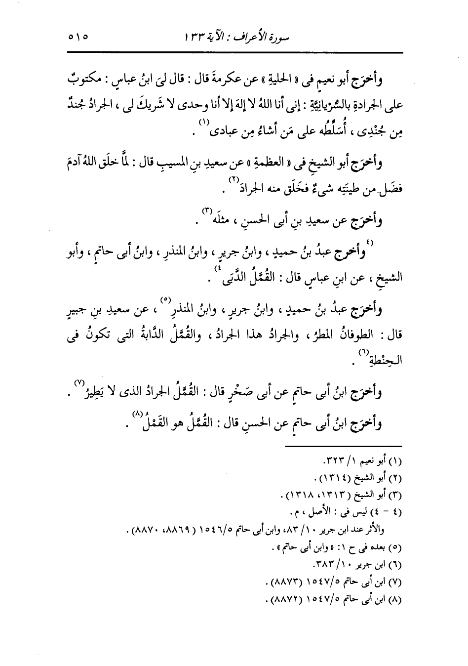 وأخرج أبو نعيم في الحلية عن عكرمة قال : قال لي ابن عباس : مكتوب على الجرادة بالسريانية : إني أنا الله لا إله إلا أنا وحدي لا شريك لي الجراد جند من جندي أسلطه على من أشاء من عبادي.
