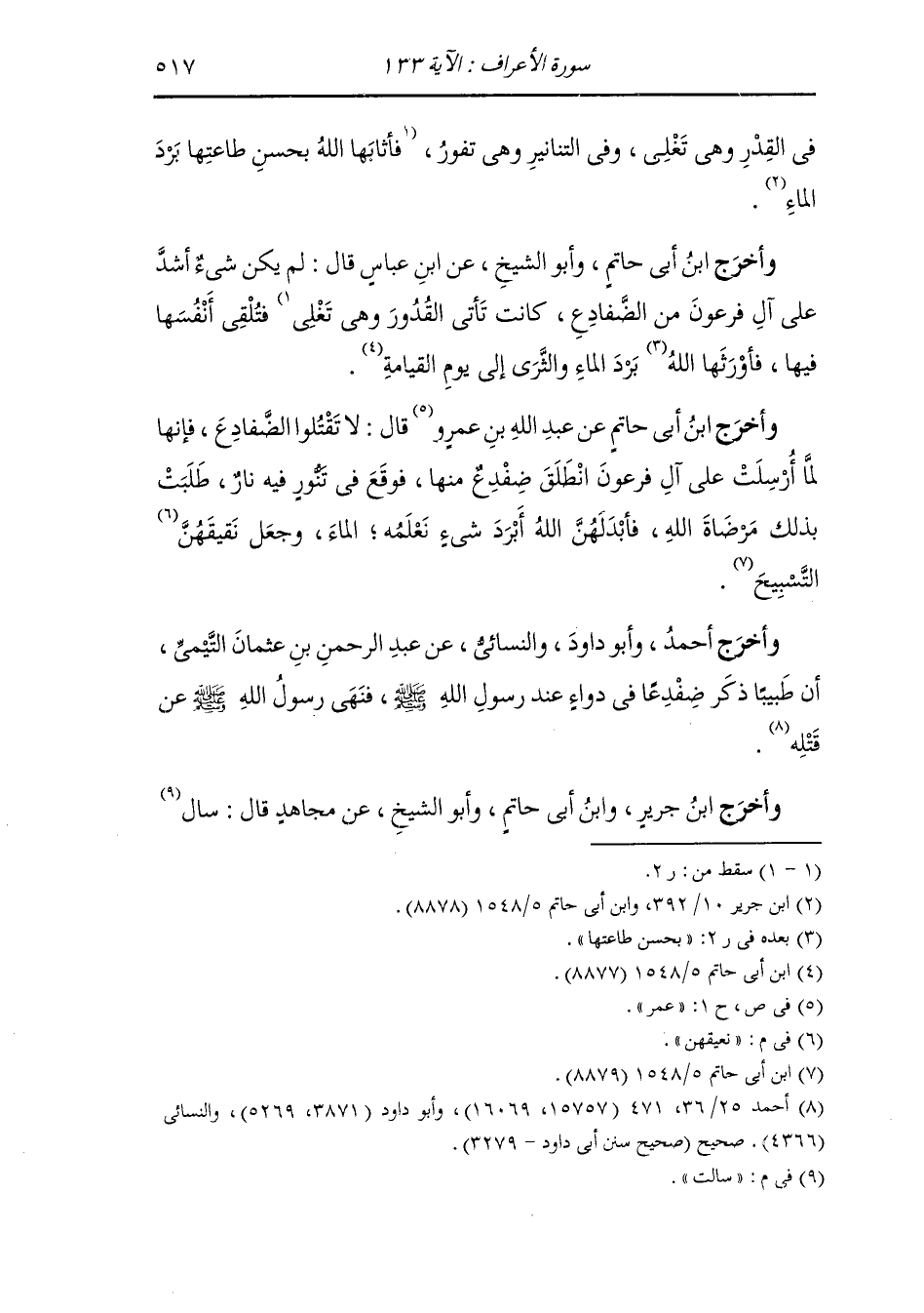 وَأَخرَج ابن أبي حاتم عن عبد الله بن عمرو قال : لا تقتلوا الضفادع فإنها لما أرسلت على آل فرعون انطلق ضفدع منها فوقع في تنور فيه نار طلبت بذلك مرضاة الله فأبدلهن الله أبرد شيء نعلمه الماء وجعل نعيقهن التسبيح.