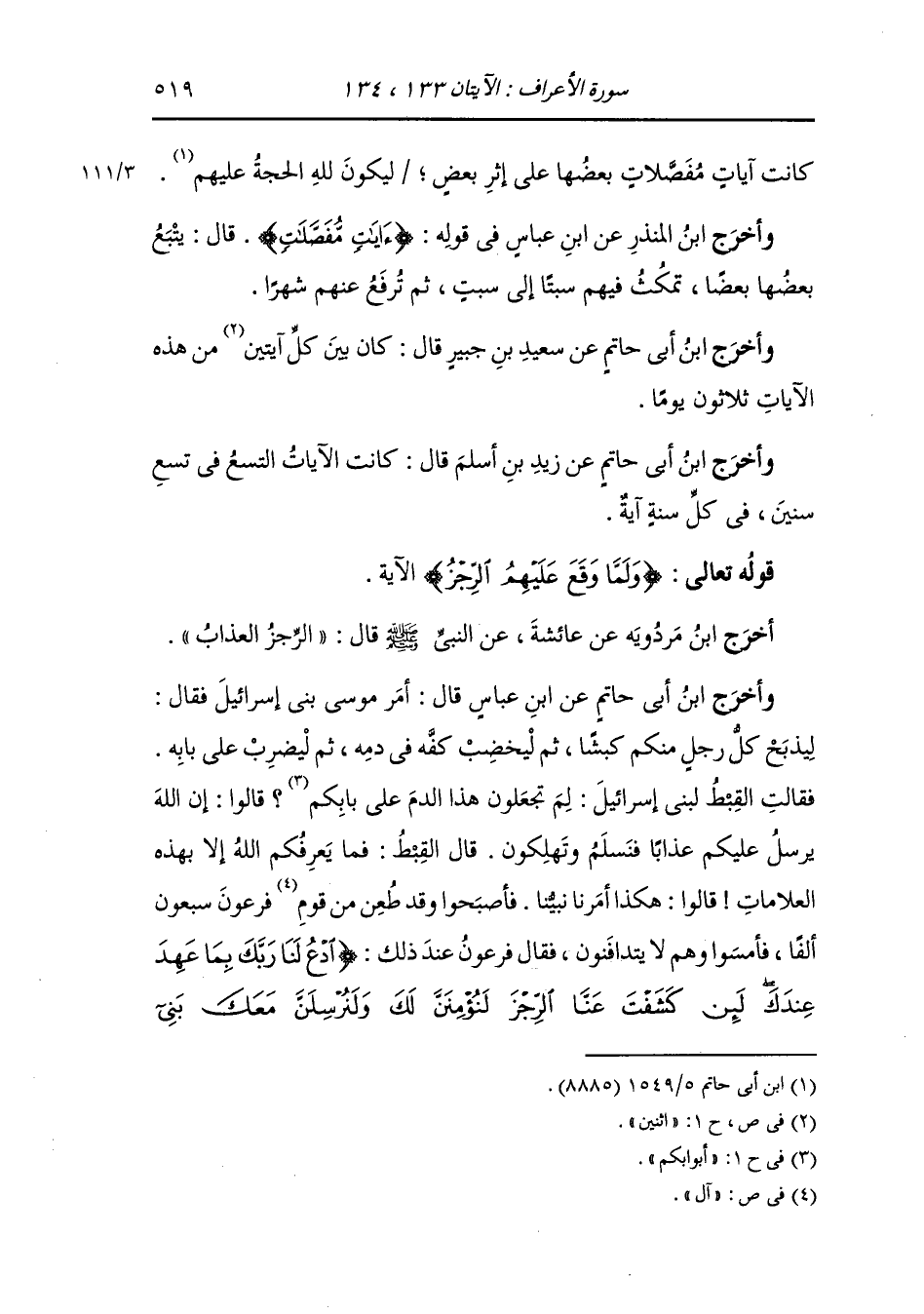 وأخرج ابن أبي حاتم عن ابن عباس قال : أمر موسى نبي إسرائيل فقال : ليذبح كل رجل منكم كبشا ثم ليخضب كفه في دمه ثم ليضرب على بابه 0 فقالت القبط لبني إسرائيل : لم تجعلون هذا الدم على بابكم قال : إن الله يرسل عليكم عذابا فنسلم وتهلكون 0 قال القبط : فما يعرفكم الله إلا بهذه العلامات قالوا : هكذا أمرنا نبينا 0 فأصبحوا وقد طعن من قوم فرعون سبعون ألفا فأمسوا وهم لا يتدافنون ، فقال فرعون عند ذلك {ادع لنا ربك بما عهد عندك لئن كشفت عنا الرجز لنؤمنن لك ولنرسلن معك بني