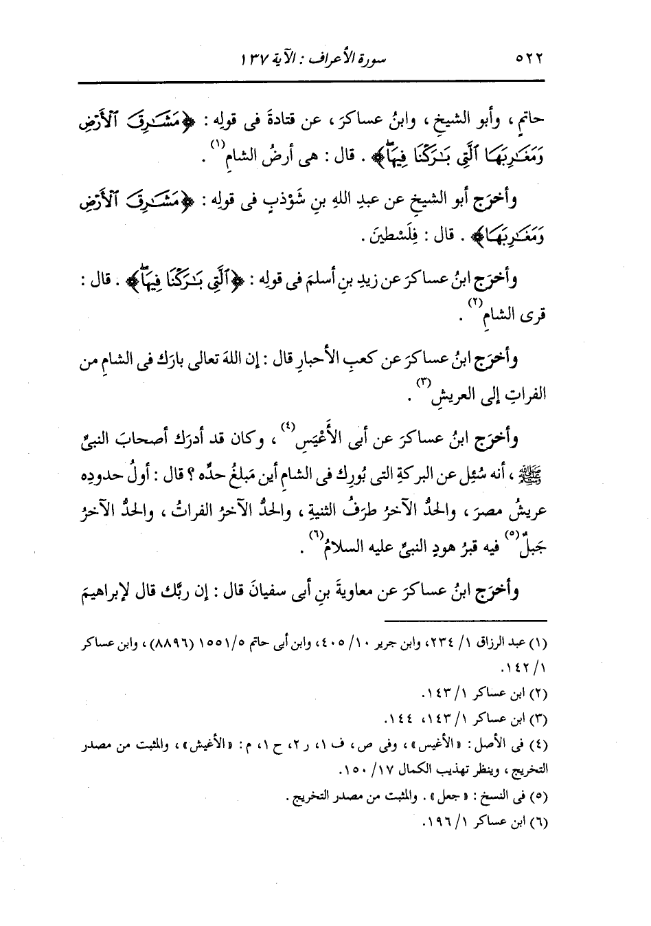 وَأَخرَج ابن عساكر عن أبي الأغبش وكان قد أدرك أصحاب النَّبِيّ صلى الله عليه وسلم ، أنه سئل عن البركة التي بوركت في الشام أين مبلغ حده قال : أول حدوده عريش مصر والحد الآخر طرف التنية والحد الآخر الفرات والحد الآخر جعل فيه قبر هود النَّبِيّ عليه السلام.