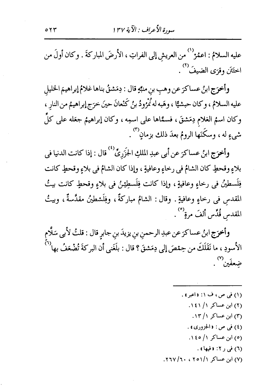 عليه السلام : أعمر من العريش إلى الفرات الأرض المباركة وكان أول من اختتن وقرى الضيف.