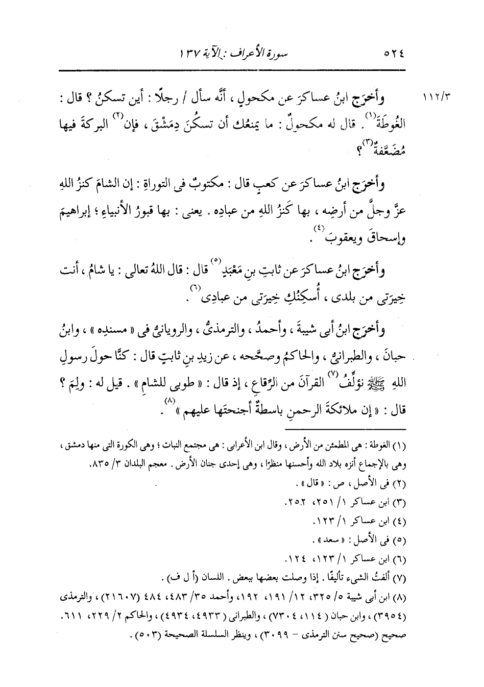 وأخرج ابن أبي شيبة وأحمد والترمذي والروياني في مسنده ، وَابن حبان والطبراني والحاكم وصححه عن زيد بن ثابت قال : كنا حول رسول الله صلى الله عليه وسلم نؤلف القرآن من الرقاع إذ قال طوبى للشام ، قيل له : ولم قال : إن ملائكة الرحمن باسطة أجنحتها عليهم