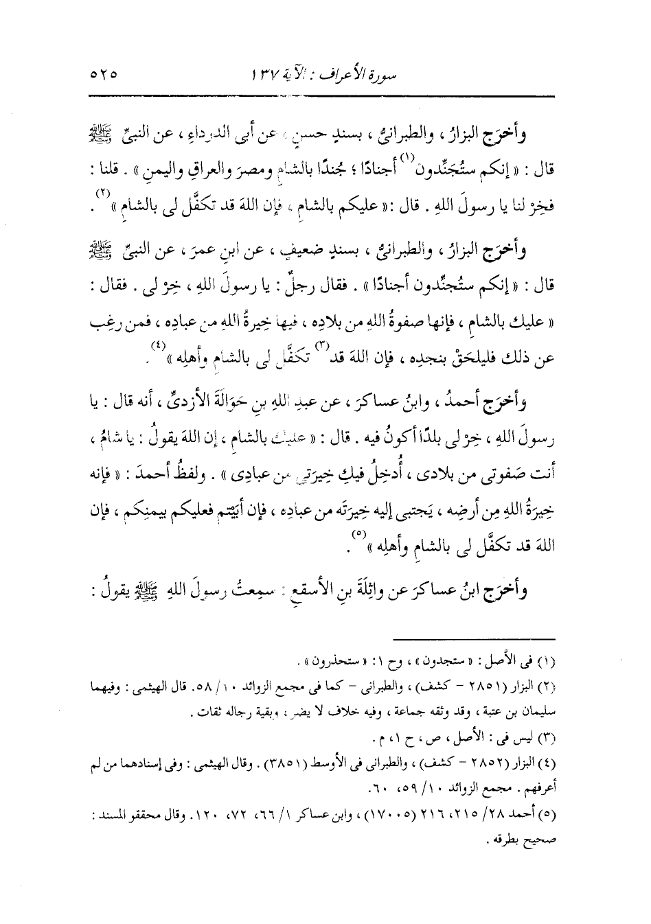 وأخرج البزار والطبراني بسند ضعيف عن ابن عمر عن النَّبِيّ صلى الله عليه وسلم قال إنكم ستجندون أجنادا ، فقال رجل : يا رسول الله خر لي ، فقال : عليك بالشام فإنها صفوة الله من بلاده فيها خيرة الله من عباده فمن رغب عن ذلك فليلحق بنجدة فإن الله تكفل لي بالشام وأهله.