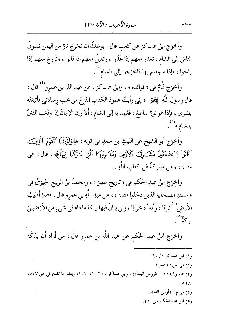 وأخرج تمام في فوائده ، وَابن عساكر عن عبد الله بن عمر وقال : قال رسول الله صلى الله عليه وسلم إني رأيت عمود الكتاب انتزع من تحت وسادتي فأتبعته بصري فإذا هو نور ساطع فعمد به إلى الشام ألا وإن الإيمان إذا وقعت الفتن بالشام.