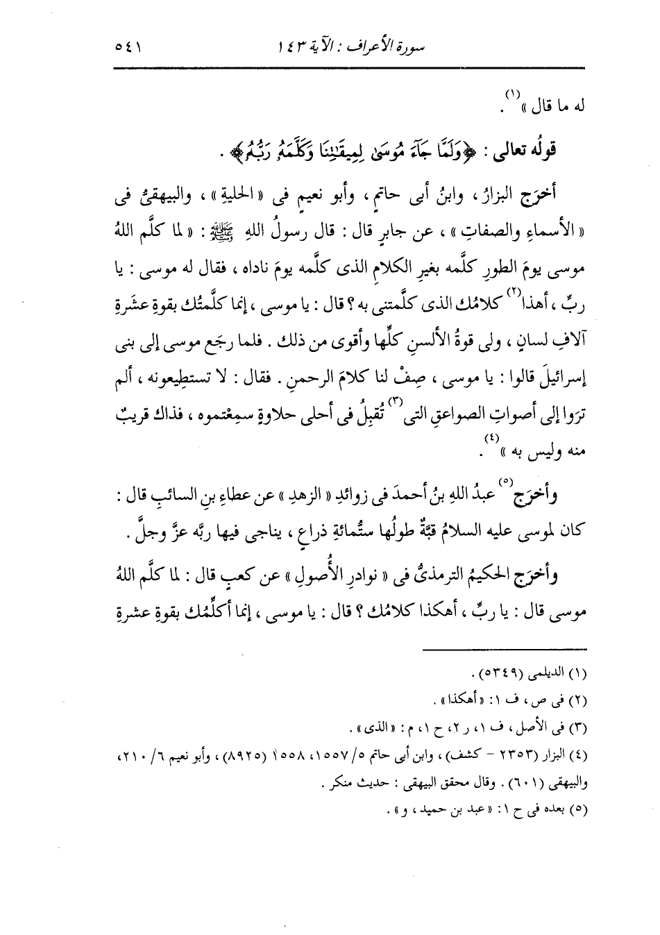 أَخرَج البزار ، وَابن أبي حاتم وأبو نعيم في الحلية والبيهقي في الأسماء والصفات ، عَن جَابر قال : قال رسول الله صلى الله عليه وسلم لما كلم الله موسى يوم الطور كلمه بغير الكلام الذي كلمه يوم ناداه فقال له موسى : يا رب أهذا كلامك الذي كلمتني به قال : يا موسى إنما كلمتك بقوة عشرة آلاف لسان ولي قوة الألسن كلها وأقوى من ذلك فلما رجع موسى إلى بني إسرائيل قالوا : يا موسى صف لنا كلام الرحمن 0 فقال : لا تستطيعونه ألم تروا إلى أصوات الصواعق الذي يقبل في أحلى حلاوة سمعتموه فذلك قريب منه وليس به.