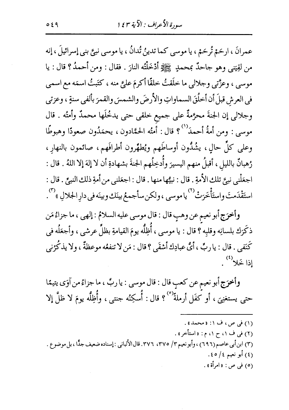 عمران ارحم ترحم يا موسى كما تدين تدان يا موسى نبأ بني إسرائيل أنه من لقيني وهو جاحد بمحمد صلى الله عليه وسلم أدخلته النار 0 فقال : ومن أحمد فقال : يا موسى وعزتي وجلالي ما خلقت خلقا أكرم علي منه كتبت اسمه مع اسمي في العرش قبل أن أخلق السموات والأرض والشمس والقمر بألفي سنة وعزتي وجلالي إن الجنة محرمة على جميع خلقي حتى يدخلها محمد وأمته 0 قال موسى : ومن أمة أحمد قال : أمته الحمادون يحمدون صعودا وهبوطا وعلى كل حال يشدون أوساطهم ويطهرون أطرافهم صائمون بالنهار رهبان بالليل أقبل منهم اليسير وأدخلهم الجنة بشهادة أن لا إله إلا الله 0 قال : اجعلني نبي تلك الأمة 0 قال : نبيها منها 0 قال : اجعلني من أمة ذلك النَّبِيّ ، قال : استقدمت واستأخر يا موسى ولكن سأجمع بينك وبينه في دار الجلال.