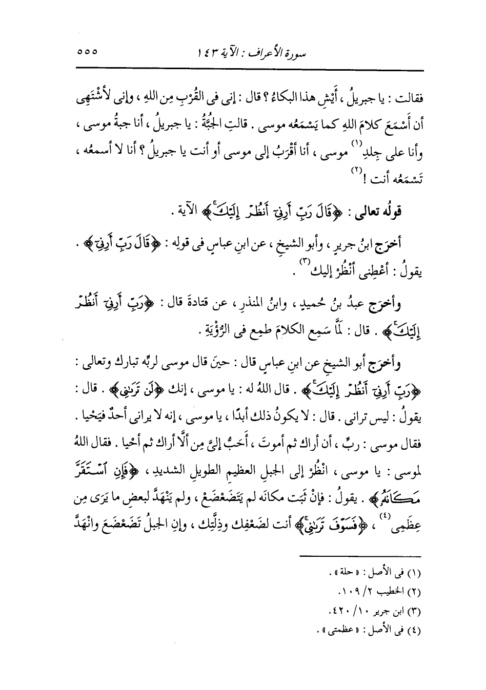 وأخرج أبو الشيخ عن ابن عباس قال : حين قال موسى لربه تبارك وتعالى {رب أرني أنظر إليك} قال الله له : يا موسى إنك لن تراني ، قال : يقول : ليس تراني ، قال : لا يكون ذلك أبدا يا موسى إنه لا يراني أحدا فيحيا ، فقال موسى : رب أن أراك ثم أموت أحب إلي من أن لا أراك ثم أحيا ، فقال الله لموسى : يا موسى انظر إلى الجبل العظيم الطويل الشديد {فإن استقر مكانه} يقول : فإن ثبت مكانه