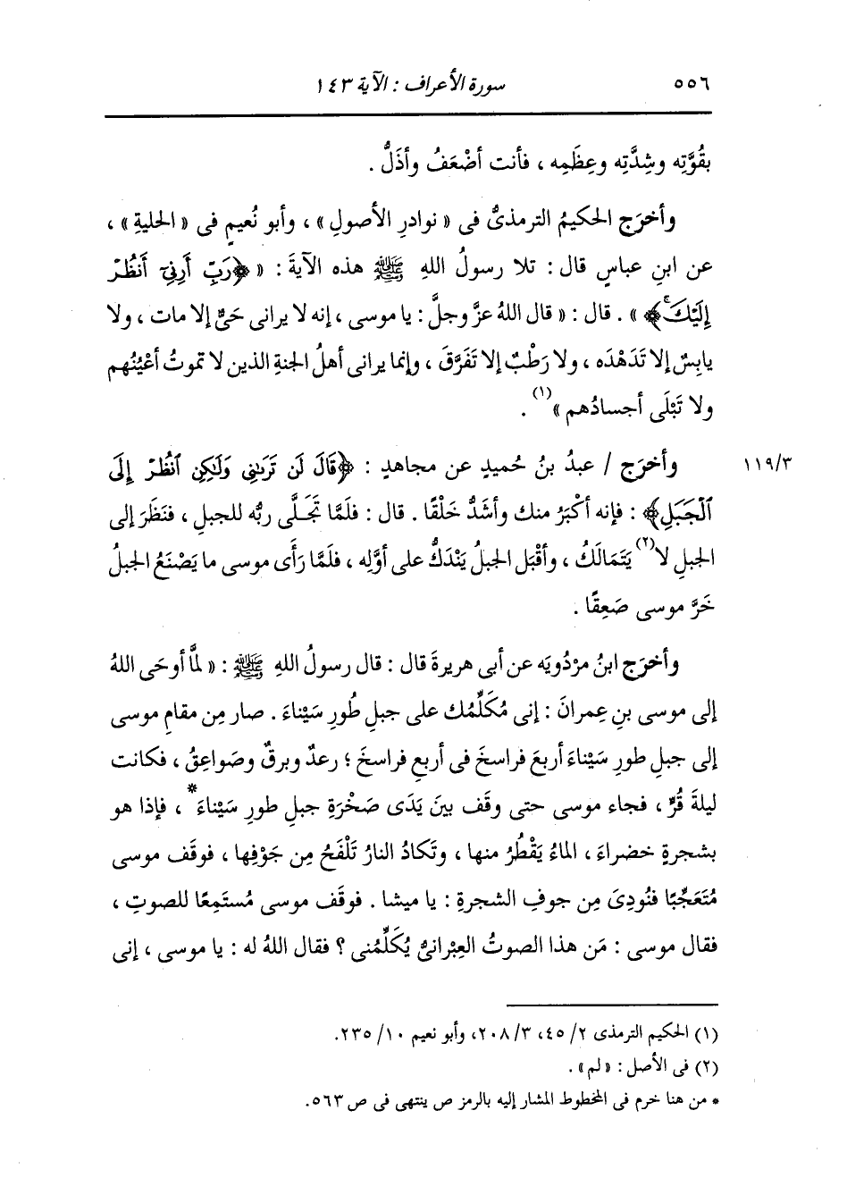 وأخرج الحكيم الترمذي في نوادر الأصول وأبو نعيم في الحلية عن ابن عباس قال : تلا رسول الله صلى الله عليه وسلم هذه الآية {رب أرني أنظر إليك} قال قال الله عر وجل : يا موسى إنه لا يراني حي إلا مات ولا يابس إلا تدهده ولا رطب إلا تفرق وإنما يراني أهل الجنة الذين لا تموت أعينهم ولا تبلى أجسادهم.