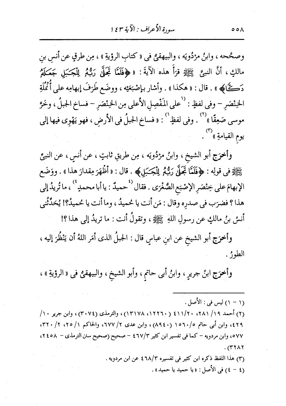 وأخرج أبو الشيخ ابن مردويه من طريق ثابت عن أنس عن النَّبِيّ صلى الله عليه وسلم في قوله {فلما تجلى ربه للجبل} قال أظهر مقدار هذا ووضع الإبهام على خنصر الإصبع الصغرى فقال حميد : يا أبا محمد ما تريد إلى هذا فضرب في صدره وقال : من أنت يا حميد وما أنت يا حميد يحدثني أنس بن مالك عن رسول الله صلى الله عليه وسلم وتقول أنت : ما تريد إلى هذا.
