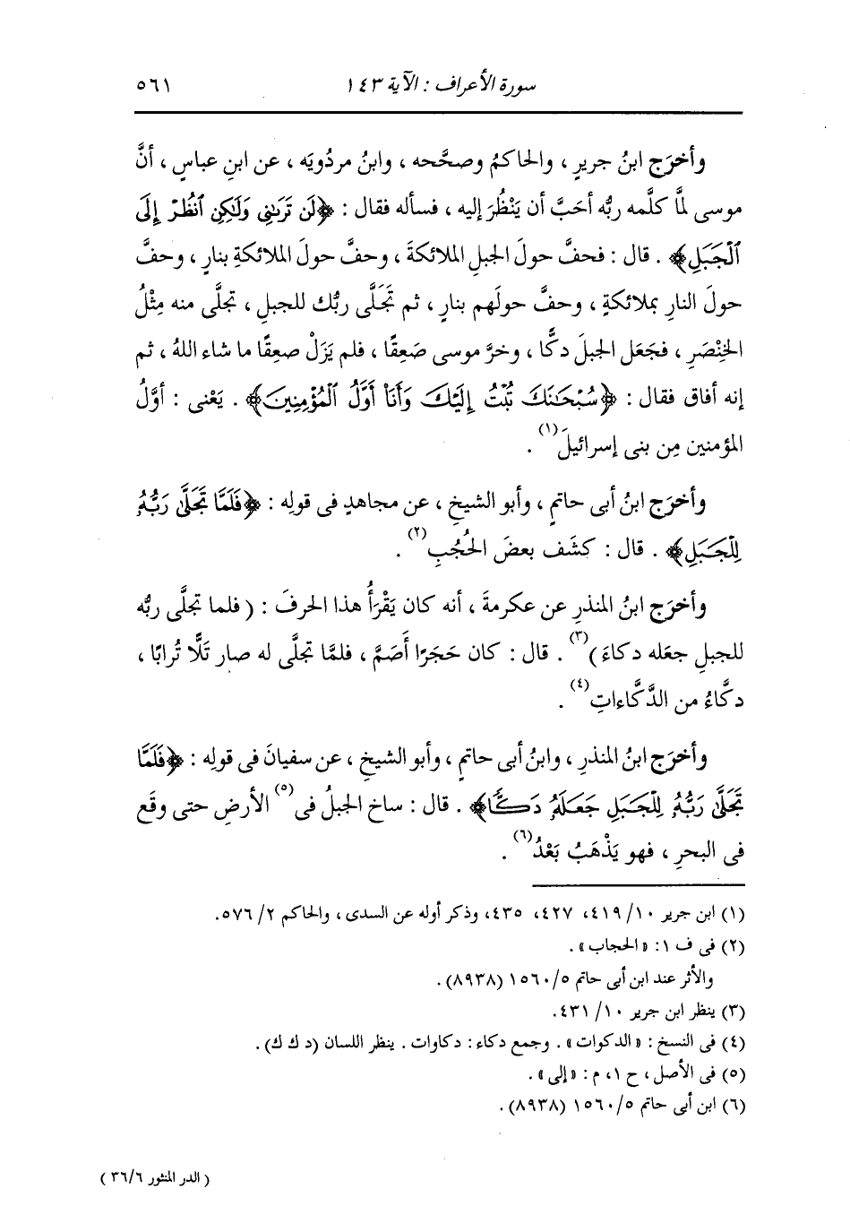وأخرج ابن جرير ، وَابن مردويه والحاكم وصححه عن ابن عباس ، أن موسى لما كلمه ربه أحب أن ينظر إليه فسأله فقال {لن تراني ولكن انظر إلى الجبل} قال : فحف حول الجبل بالملائكة وحف حول الملائكة بنار وحف حول النار بالملائكة وحف حولهم بنار ثم تجلى ربك للجبل تجلى منه مثل الخنصر فجعل الجبل دكا وخر موسى صعقا فلم يزل صعقا ما شاء الله ثم إنه أفاق فقال {سبحانك تبت إليك وأنا أول المؤمنين} يعني أول المؤمنين من بني إسرائيل.