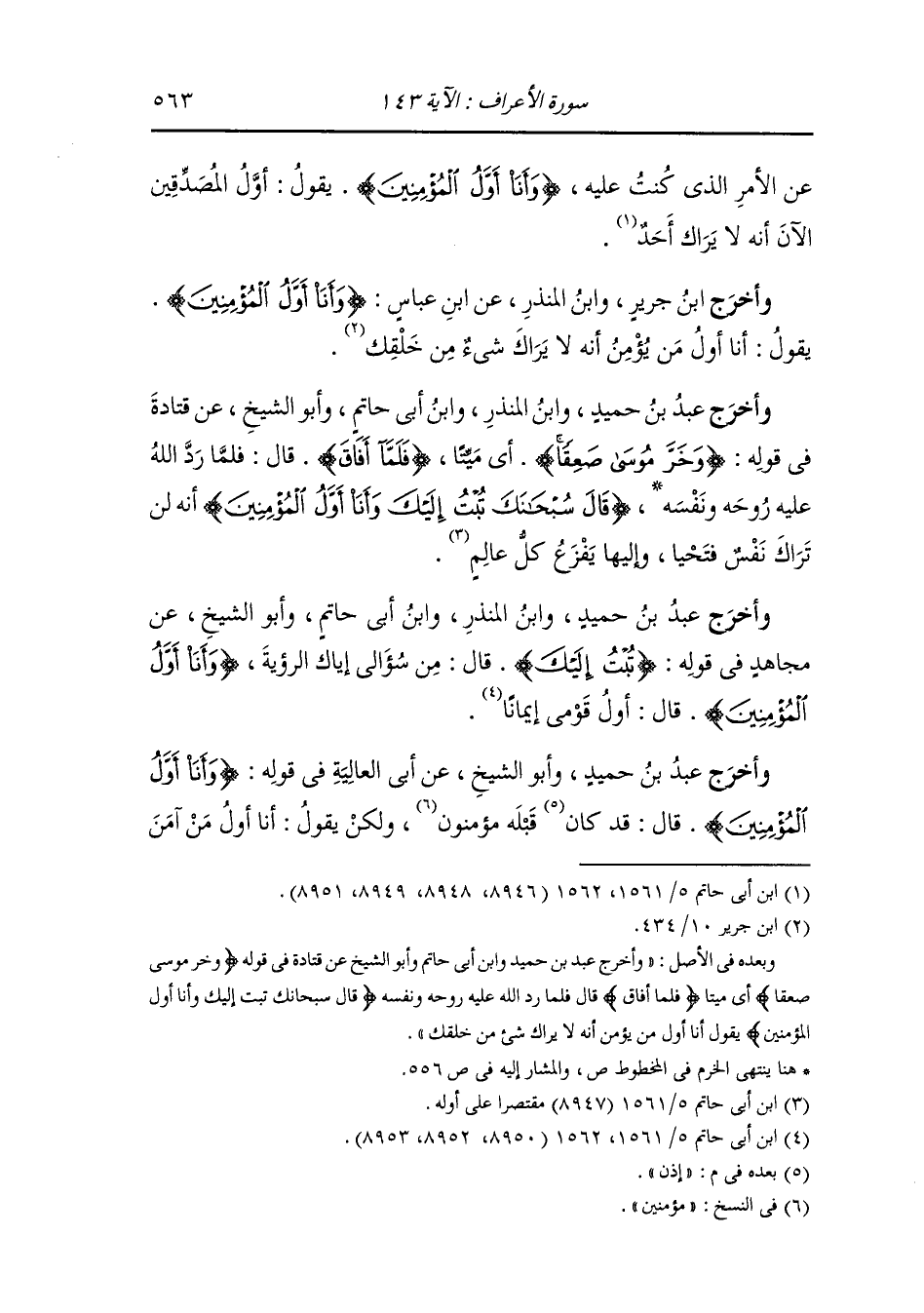 وأخرج ابن جرير ، وَابن المنذر عن ابن عباس {وأنا أول المؤمنين} يقول : أنا أول من يؤمن أنه لا يراك شيء من خلقك.