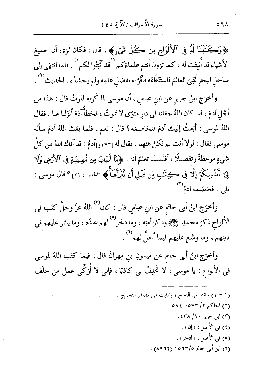 {وكتبنا له في الألواح من كل شيء} قال : فكان يرى أن جميع الأشياء قد أثبتت له كما ترون أنتم علماءكم فلما انتهى إلى ساحل البحر لقي العالم فاستنطقه فأقر له بفضل علمه ولم يحسده الحديث.