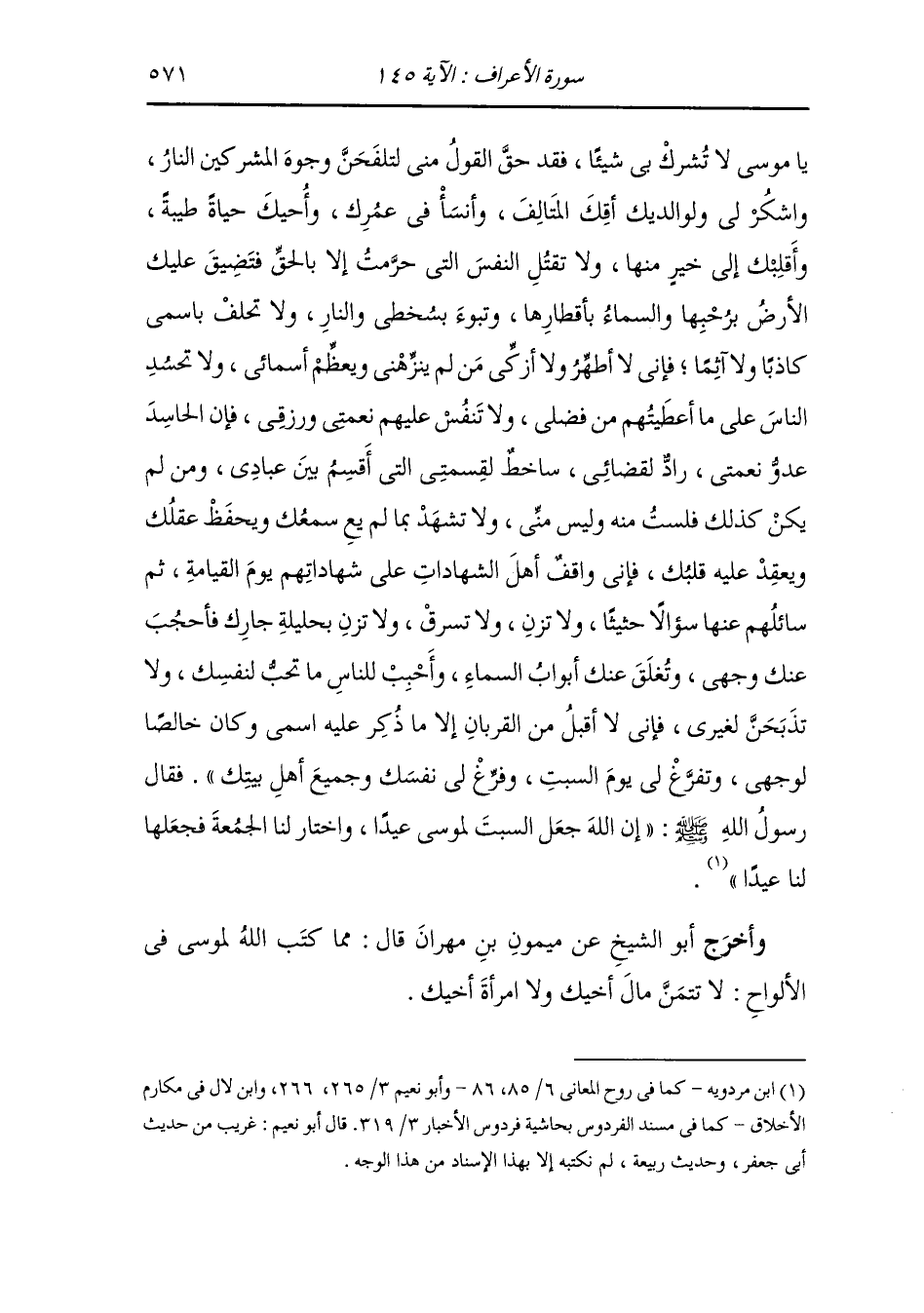 وأخرج أبو الشيخ عن ميمون بن مهران قال : مما كتب الله لموسى في الألواح لا تتمن مال أخيك ولا امرأة أخيك
