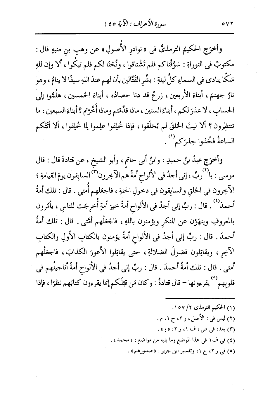 وأخرج عَبد بن حُمَيد ، وَابن أبي حاتم وأبو الشيخ عن قتادة قال : قال موسى : رب إني أجد في الألواح أمة هم الآخرون السابقون يوم القيامة الآخرون في الخلق والسابقون في دخول الجنة فاجعلهم أمتي ، قال : تلك أمة أحمد ، قال : رب إني أجد في الألواح أمة خير أمة أخرجت للناس يأمرون بالمعروف وينهون عن المنكر ويؤمنون بالله فاجعلهم أمتي ، قال : تلك أمة أحمد ، قال : رب إني أجد في الألواح أمة يؤمنون بالكتاب الأول والكتاب الآخر ويقاتلون فضول الضلالة حتى يقاتلوا الأعور الكذاب فاجعلهم أمتي ، قال : تلك أمة أحمد ، قال : رب إني أجد في الألواح أمة أناجيلهم في قلوبهم يقرأونها - قال قتادة : وكان من قبلكم إنما يقرأون كتابهم نظرا فإذا